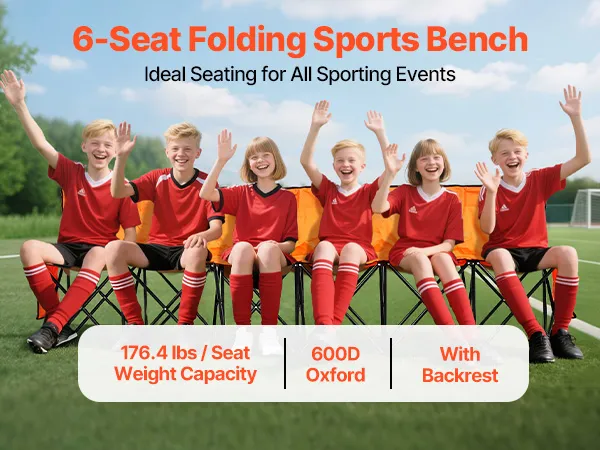 VEVOR Portable Folding Bench, 6 Seat Foldable Soccer Bench with Side Pockets and Carrying Bag, Lightweight Sideline Seating with Back Rest for Football, Baseball, Camping, Outdoor Events, Orange