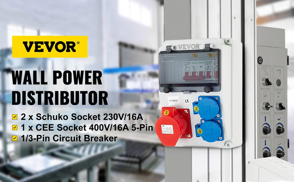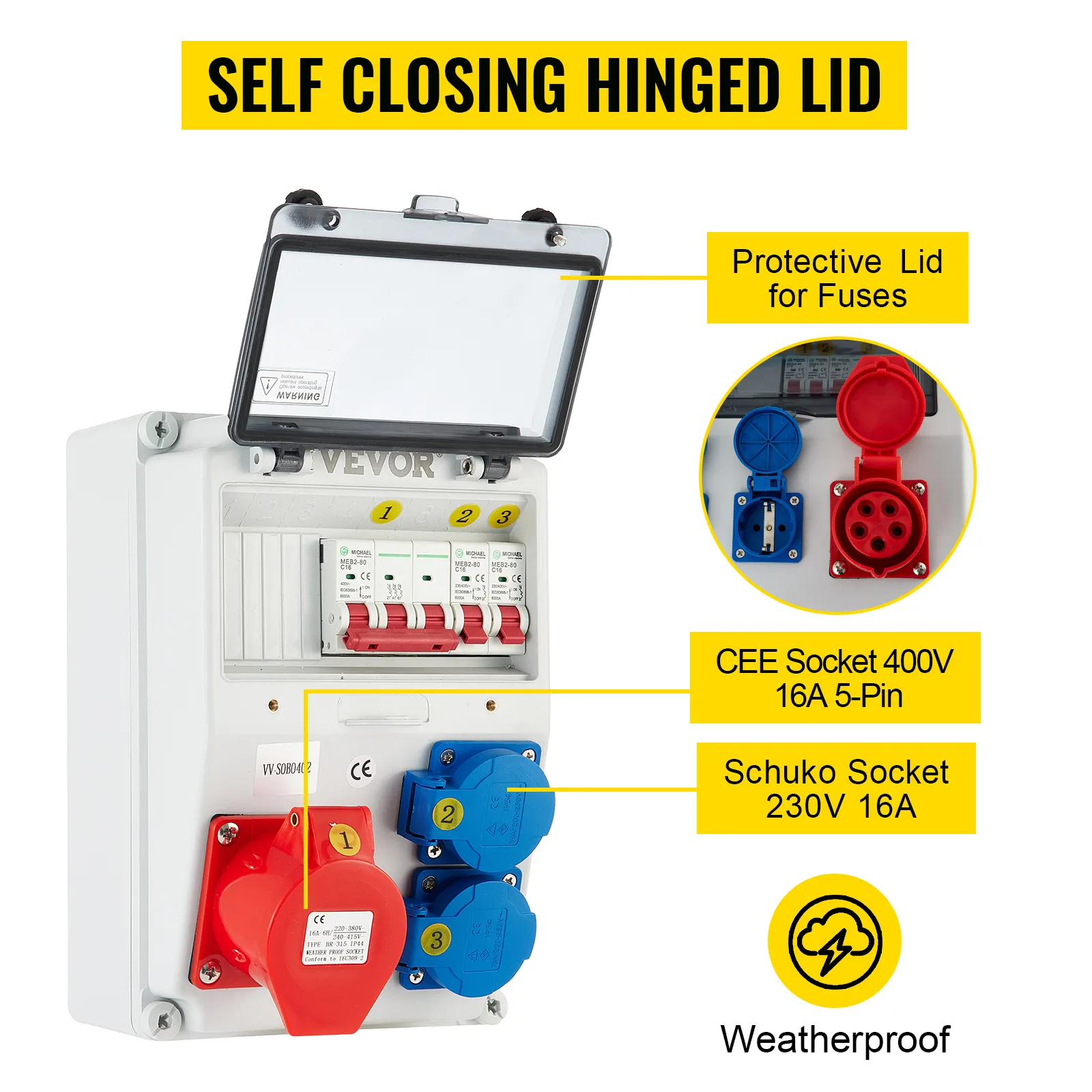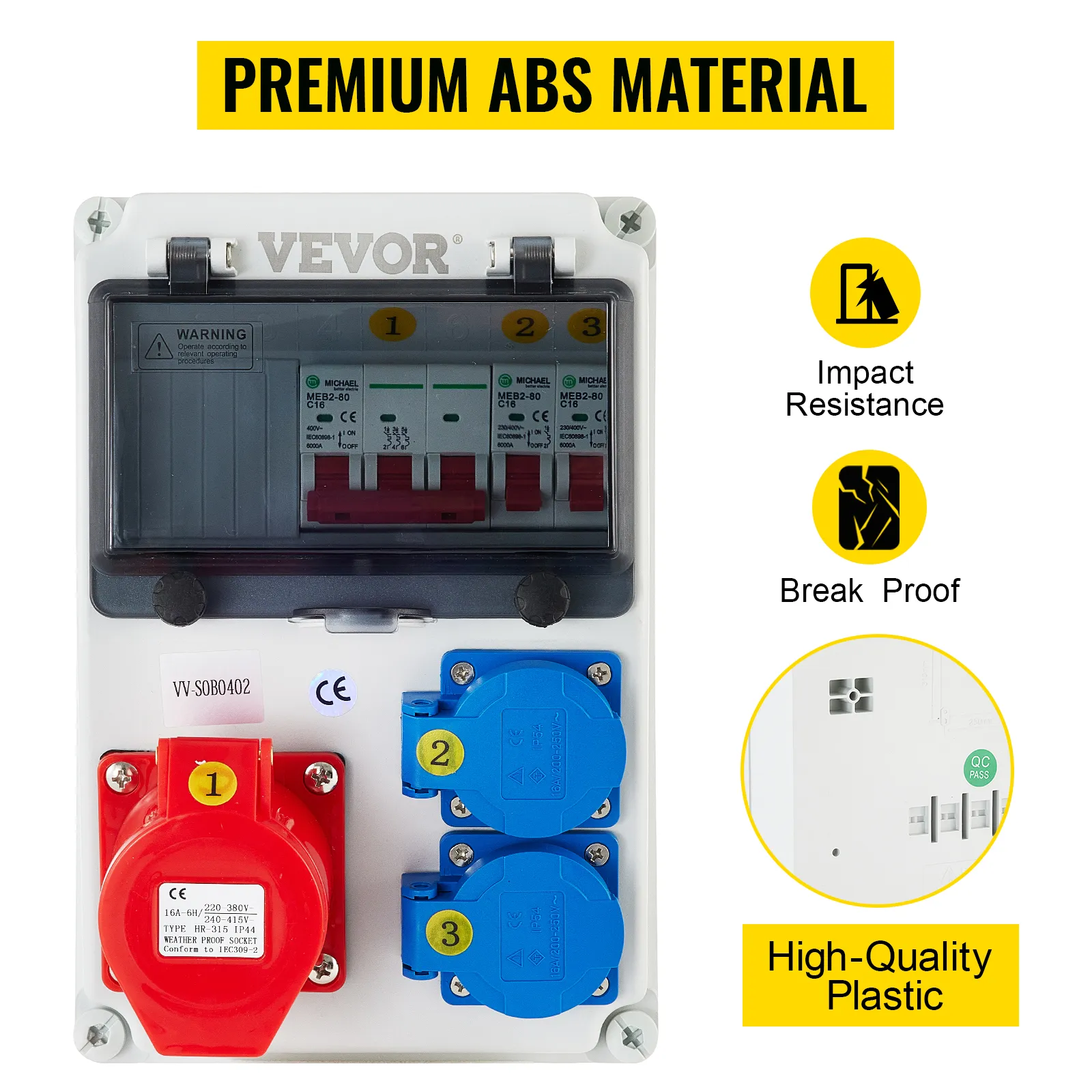 VEVOR Wall Power Distributor, ABS Plastic, Distribution Board with 2 x Schuko Socket 230V/16A ABL IP54, 1 x CEE Socket 400V/16A 5-Pin ABL IP44, 1/3-Pin Circuit Breaker, for Outdoor Construction Site