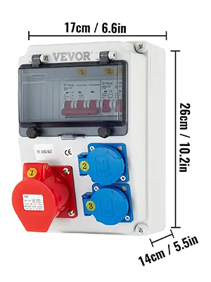 Box Contents: 2 x Schuko-Sockets 230 V, 16 A, Blue Sockets ABL IP54; 1 x CEE Sockets 400 V, 16 A, 5-Pin, Red Sockets ABL IP44; 2 x 1-Pin LS C16A Circuit Breaker; 1 x 3-Pin LS C16A Circuit Breaker. Rated Working Voltage: AC 230 / 400V; Pin Number Of Output Socket: 3-Pin / 5-Pin.