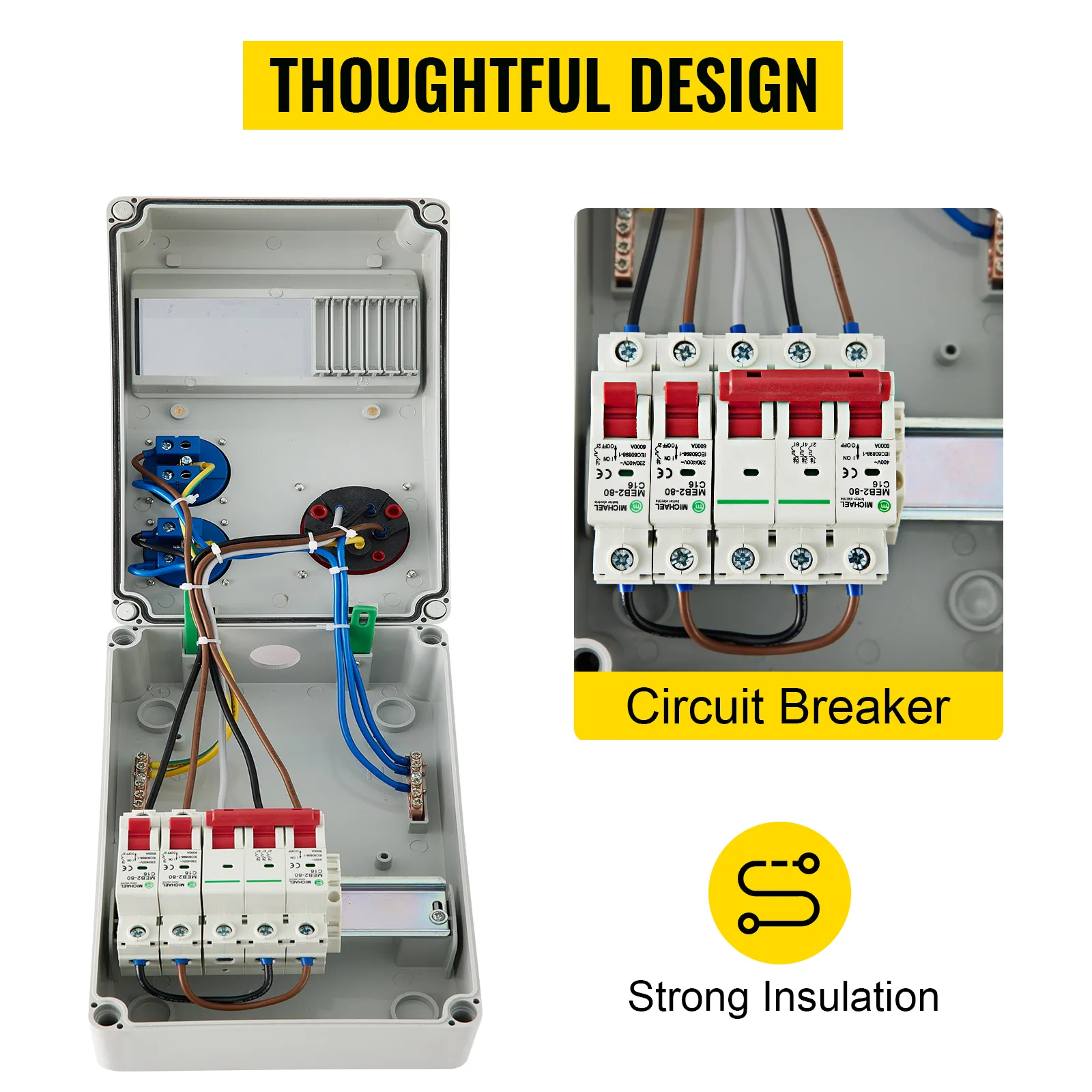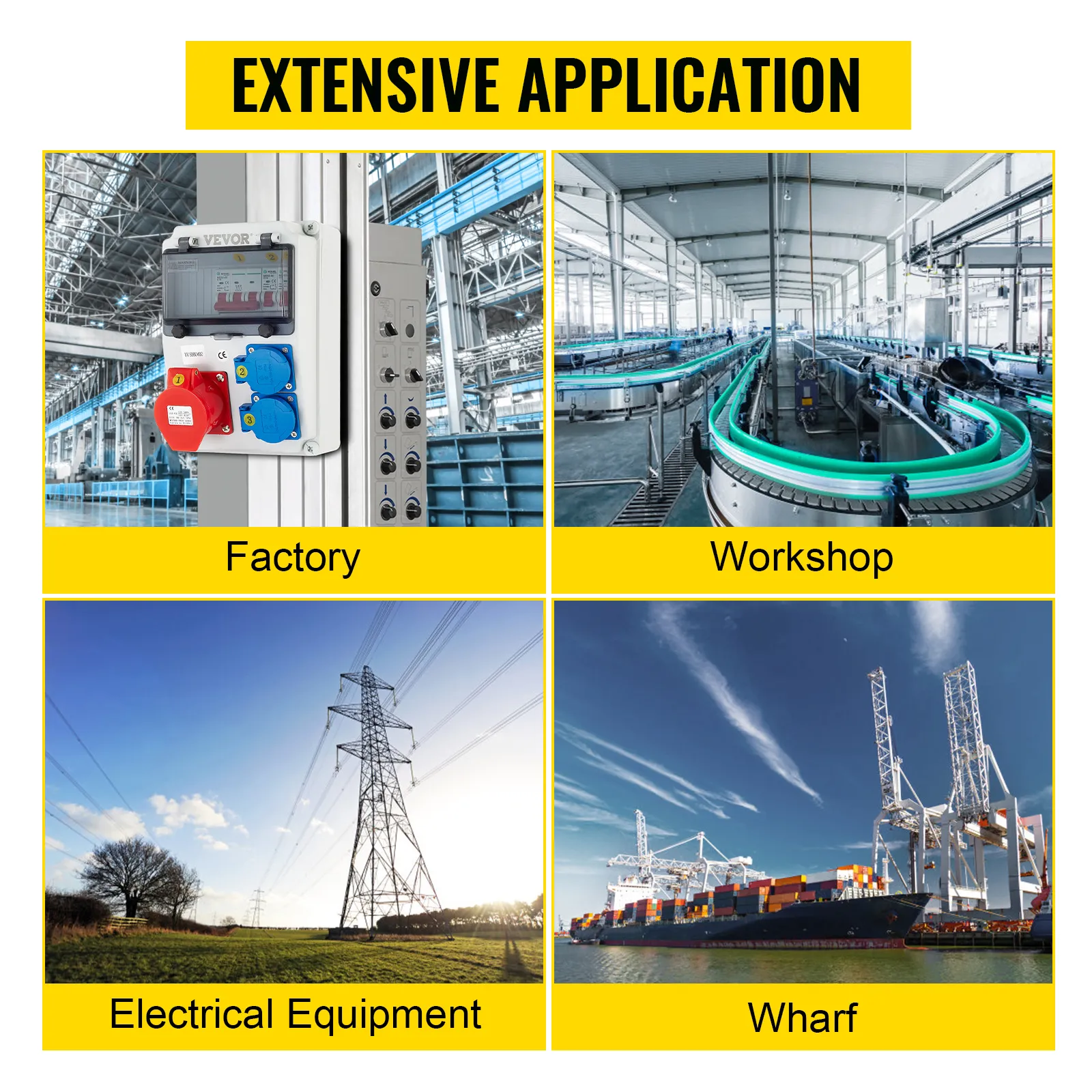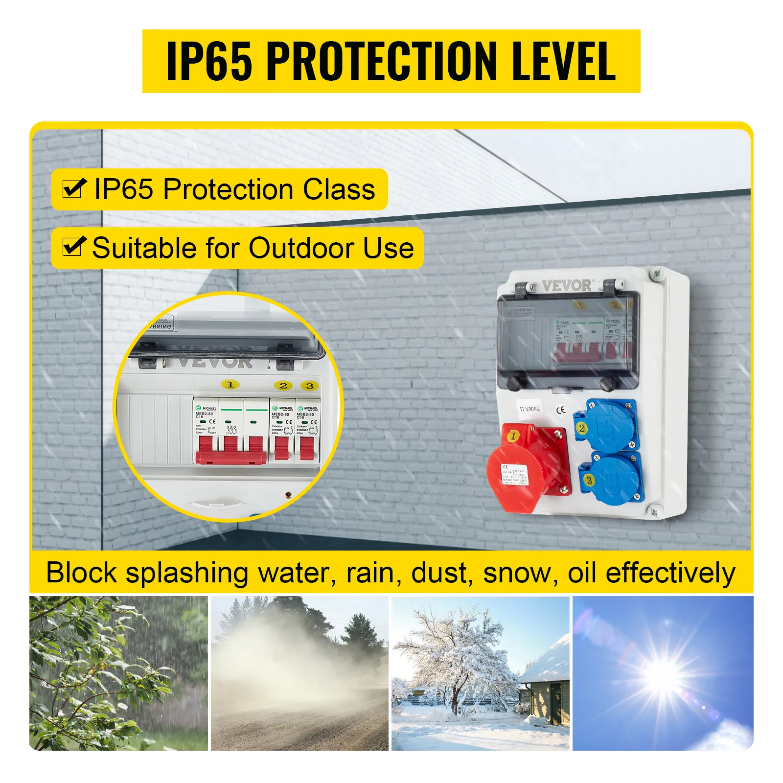 The compact wall power distributor from VEVOR outshines the competition with its high quality and unmatched security in all areas. This power distribution board adopts a good quality ABS plastic shell with an IP65 protection level for long service life. A self-closing hinged lid for the socket and a waterproof plastic lid for the circuit breaker are adopted to ensure more security and avoid damage. Ideal for construction sites, constant outdoor use, etc.