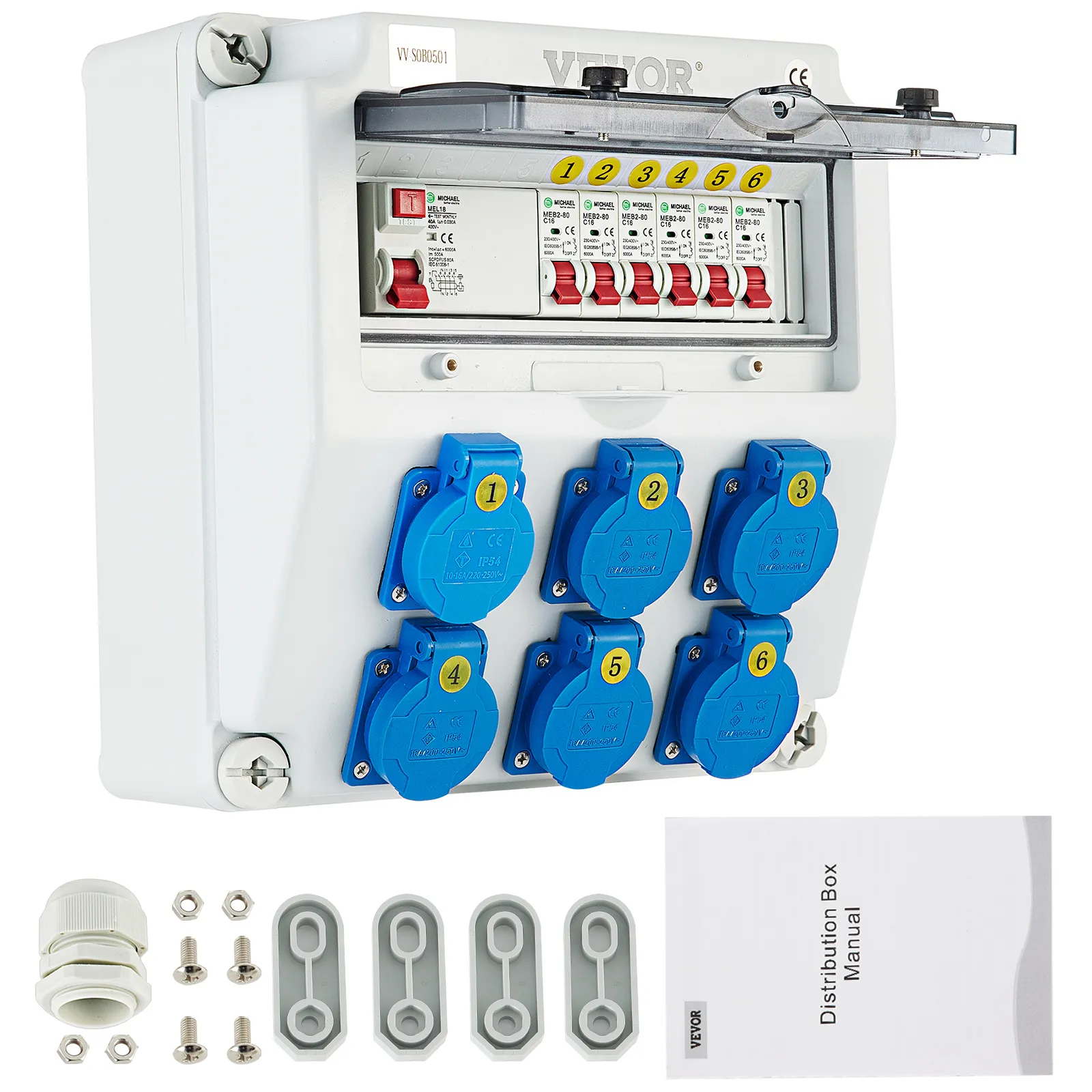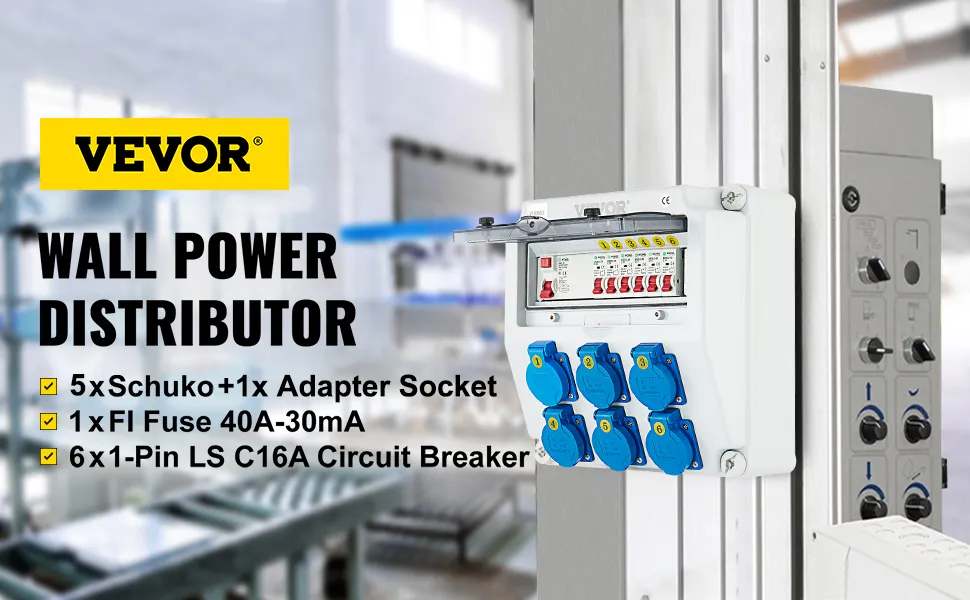 VEVOR Wall Power Distributor, ABS Plastic, Distribution Board with 6 x Schuko-Sockets 230 V 16 A Blue ABL IP54, 1 x FI Fuse 40A-30mA, 6 x 1-Pin LS C16A Circuit Breaker, for Outdoor Construction Site