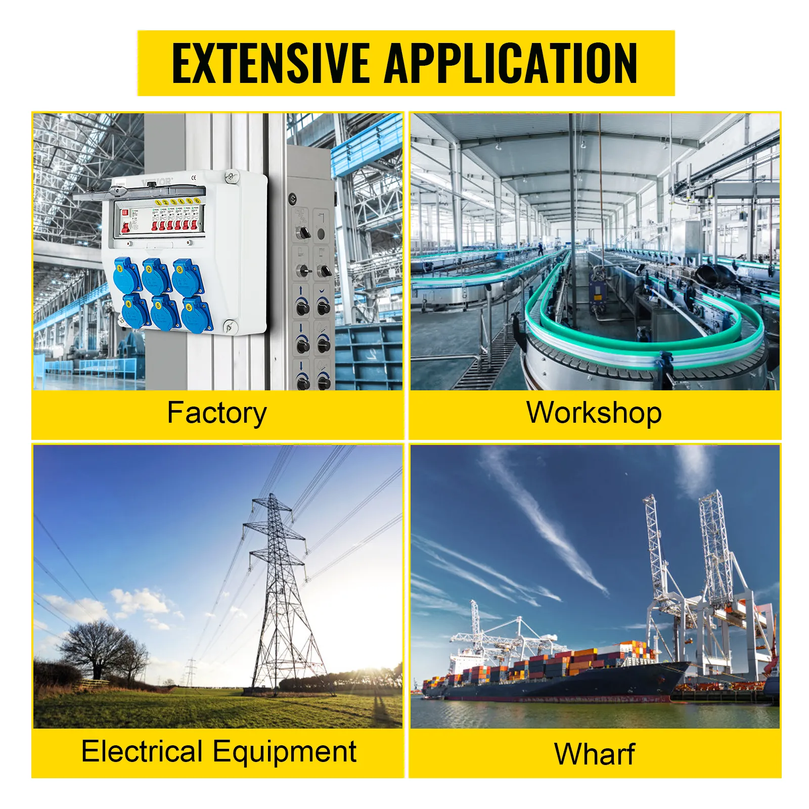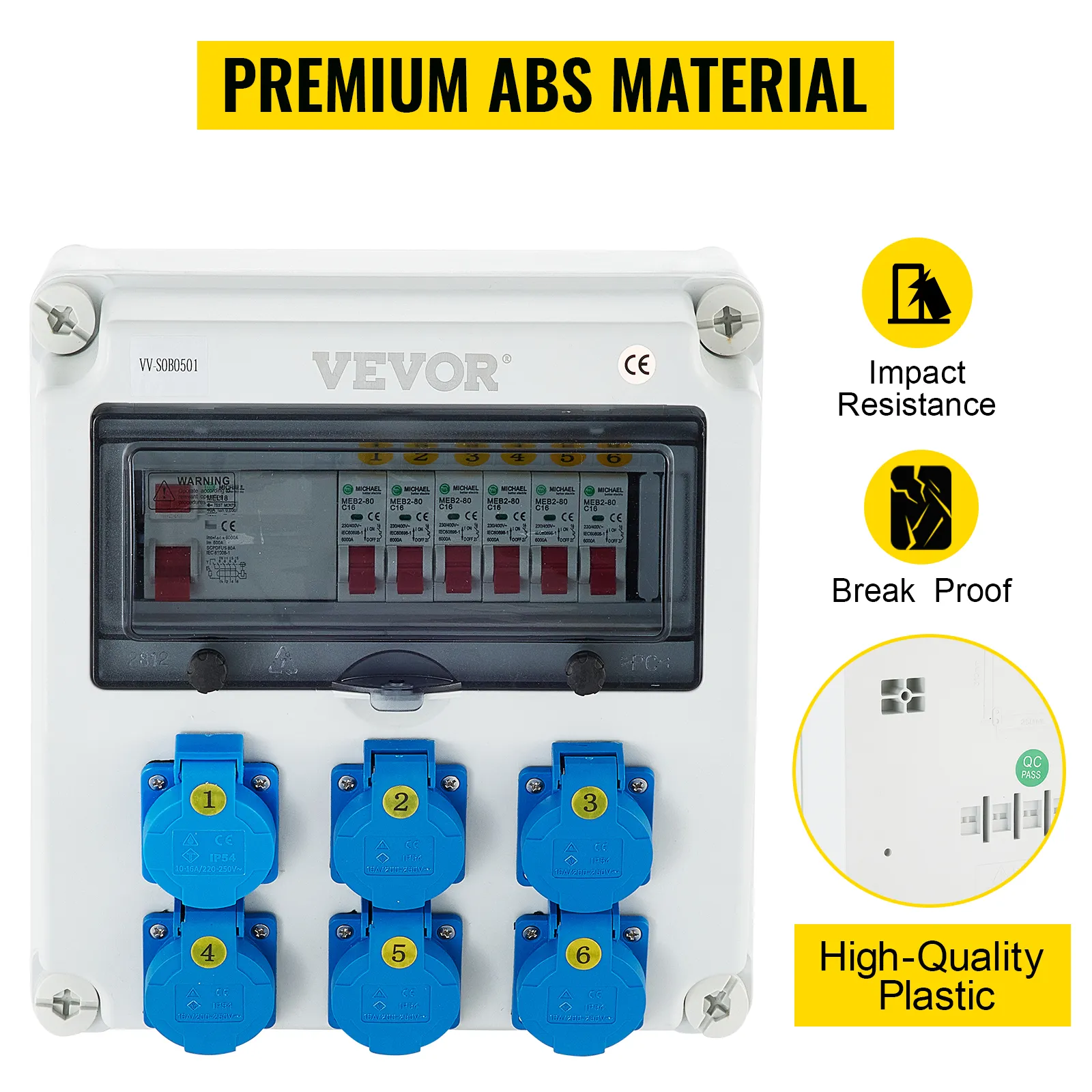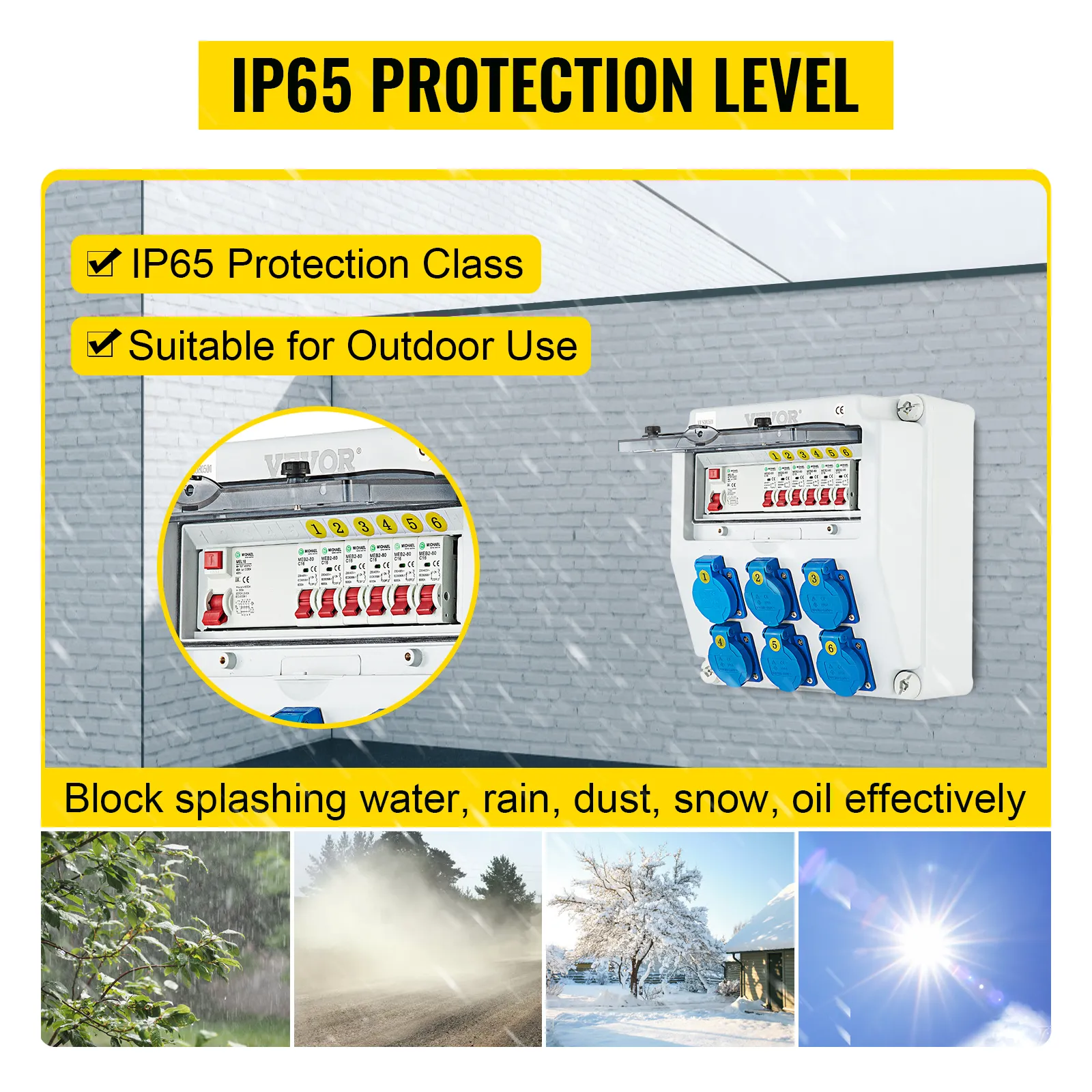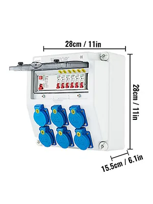 The compact wall power distributor from VEVOR outshines the competition with its high quality and unmatched security in all areas. This power distribution board adopts a good quality ABS plastic shell with an IP65 protection level for long service life. A self-closing hinged lid for the socket and a waterproof plastic lid for the circuit breaker are adopted to ensure more security and avoid damage. Ideal for construction sites, constant outdoor use, etc.