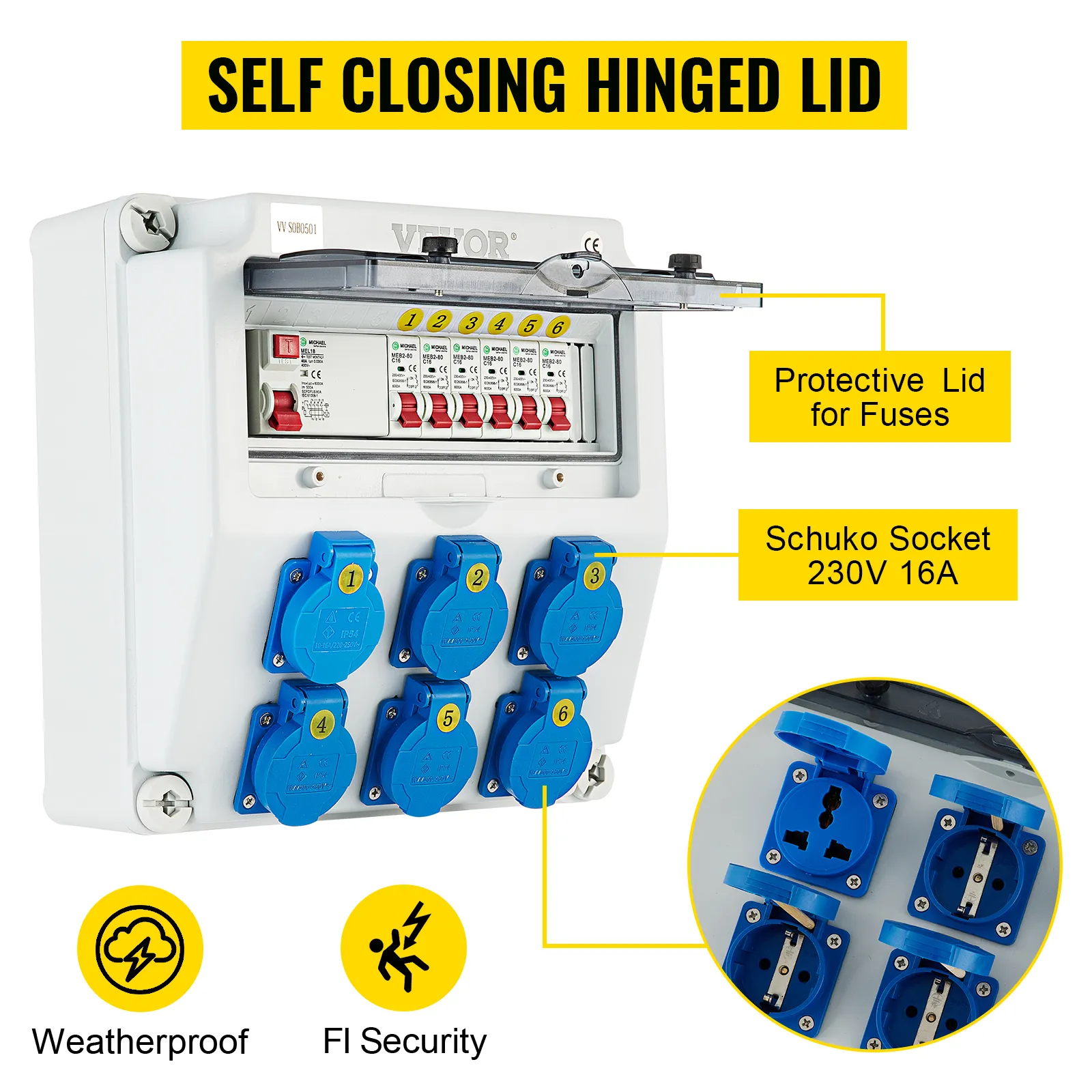 IP65 Shell & IP44 Socket: The wall power distributor enclosure reaches IP65 protection level, while the protection level of the socket is IP44. It is splash-proof, avoiding dirt and water entering the box. The socket is secured via the circuit breaker and self closing hinged lid. With FI fuse for more security, protects against possible power accidents.