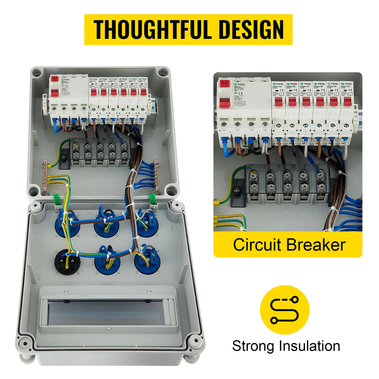 This distribution board power can be easily used outdoors due to its exquisite details. Furthermore, the circuit breaker in the box is equipped with a waterproof plastic lid, which helps avoid damage to the inner cables.