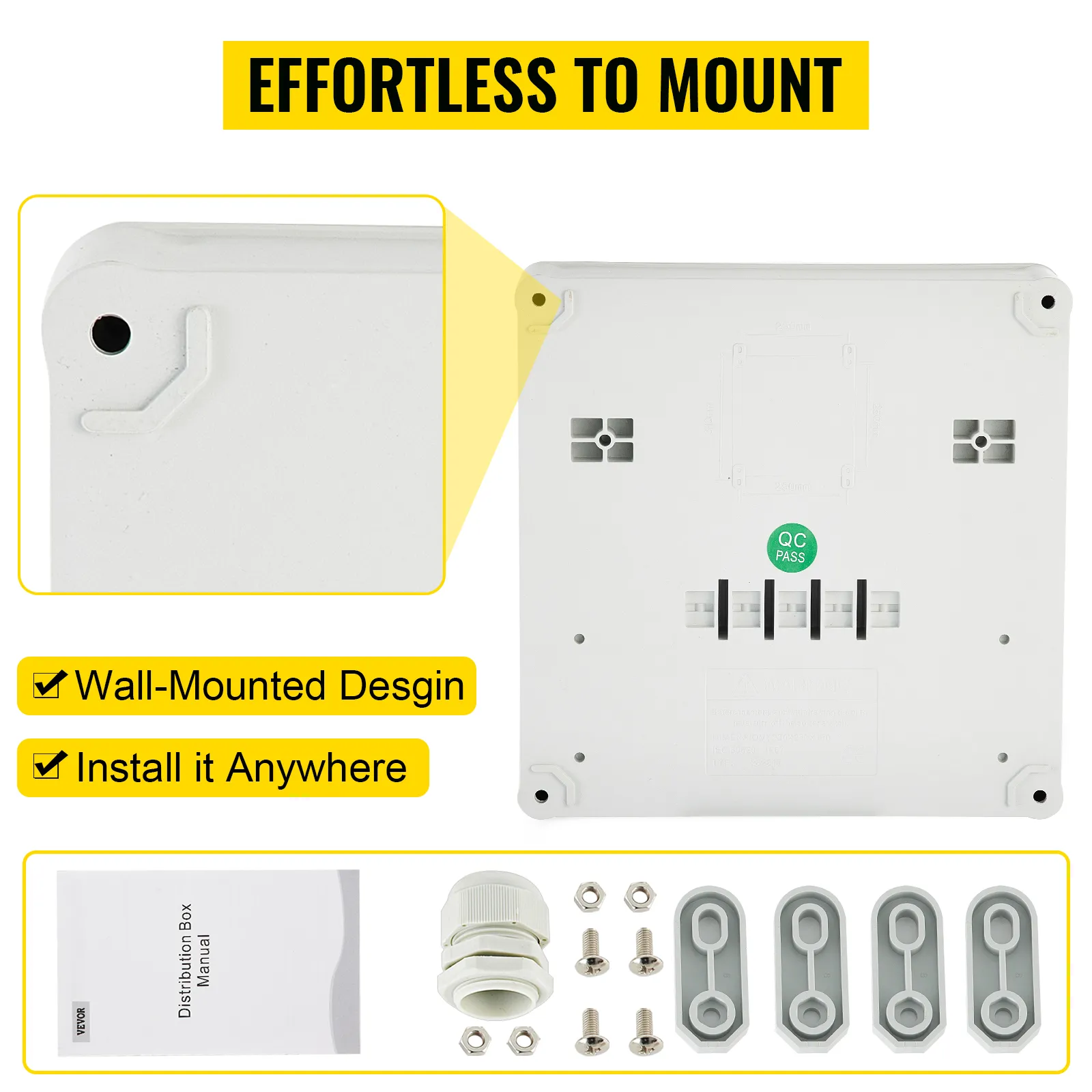 The outdoor power distributor has a wall-mounted design and complete mounting accessories that can be installed anywhere. In addition, multiple mounting holes on the body can quickly fix the power distribution box to the wall.