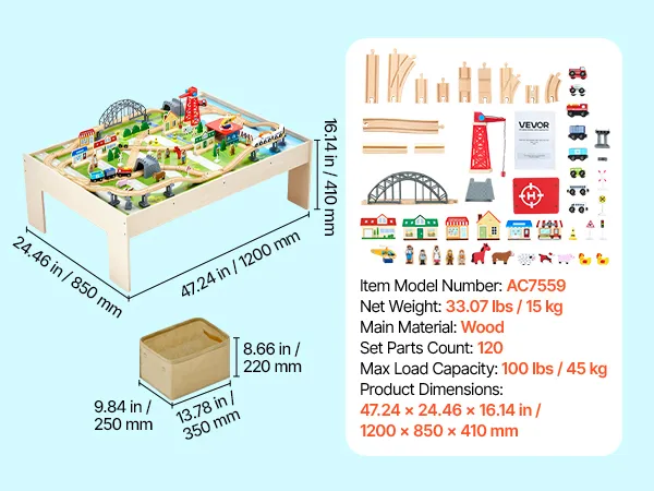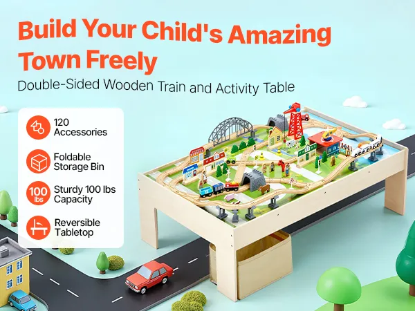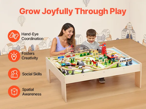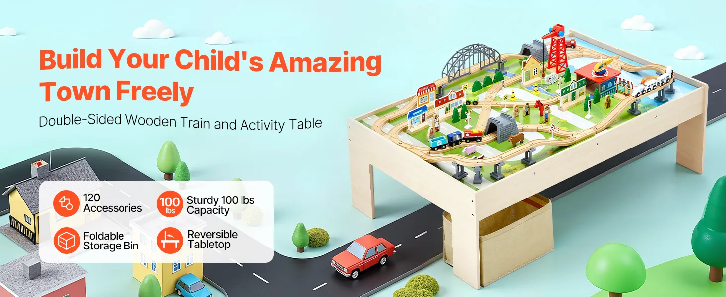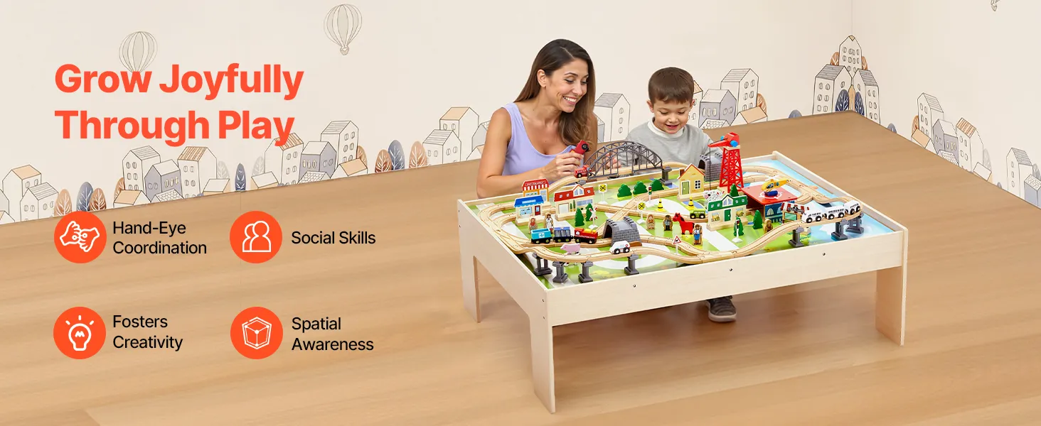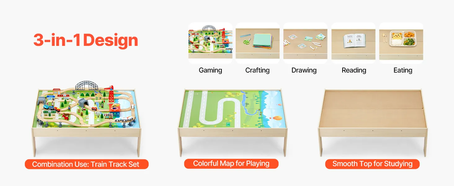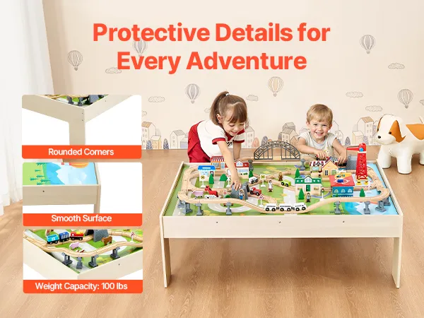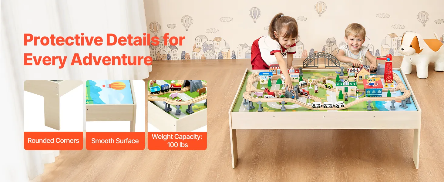The train table features rounded corners to avoid bumps, a smooth, burr-free surface to avoid scratches, and a 100lbs weight capacity, built to withstand kids' play for parents' peace of mind.