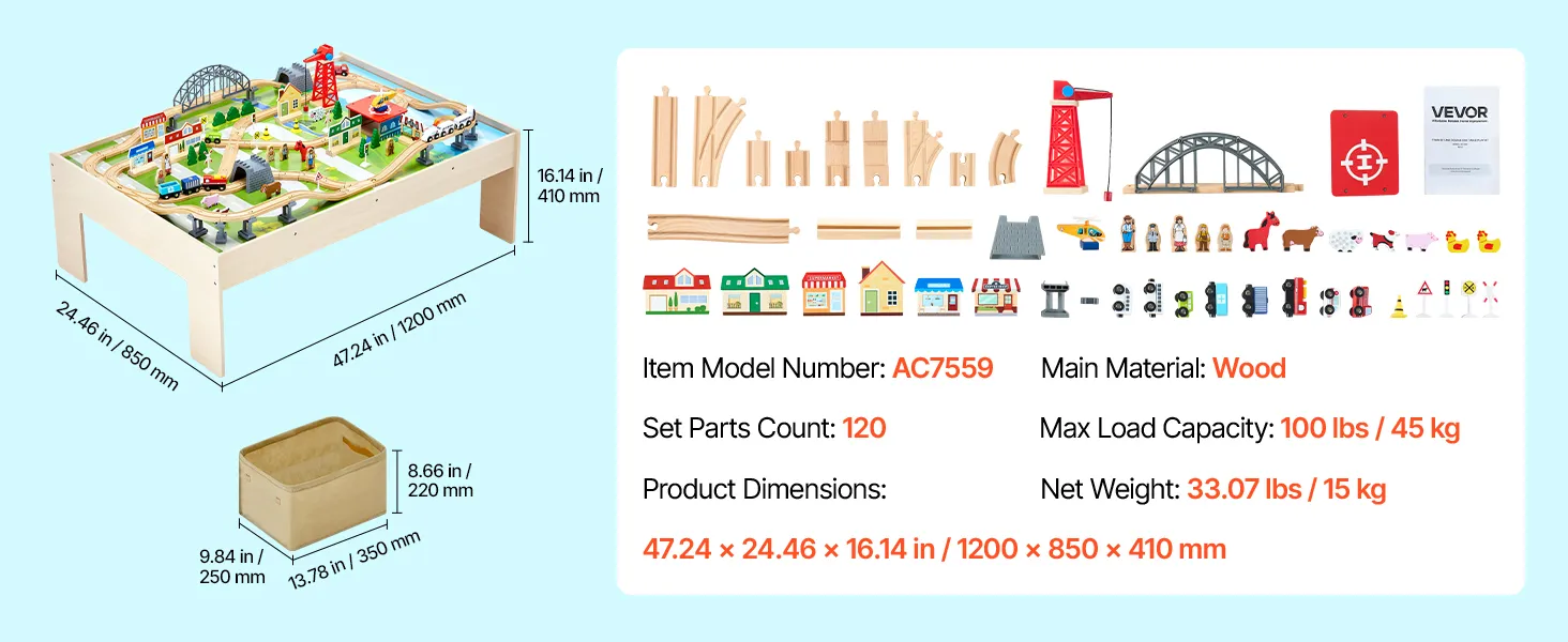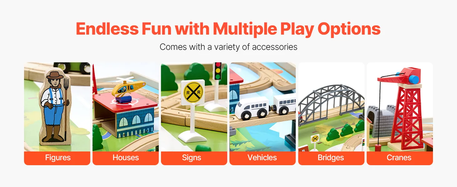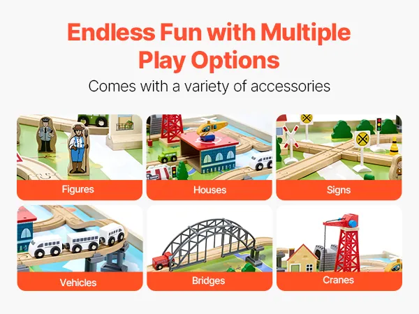 120-Piece Play Set: Our wooden train table set includes 120 accessories with realistic models like trains, tracks, cars, buildings, and more. The colorful pieces inspire imagination, improve hand-eye coordination, and boost creativity