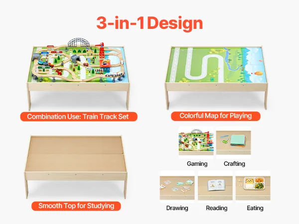Multifunctional Tabletop: The kids train table has a reversible surface—one side for play with train tracks, and the other for studying, crafts, and drawing, providing versatile use and practicality