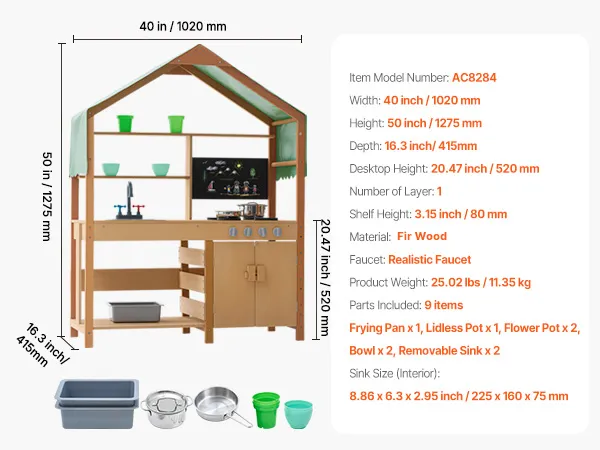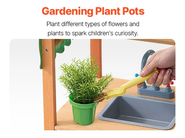 Fun Developmental Gift: This wooden toy playset comes with 8 kitchen accessories, including: 1 frying pan, 1 pot with a lid, 2 flowerpots, 2 bowls, and 2 removable sinks. It makes the perfect birthday or holiday gift for children! With a 20.5-inch high countertop, kids can easily place and organize items on their own, improving their hand-eye coordination. The spacious workspace allows kids to play with friends, boosting teamwork and social skills while having fun