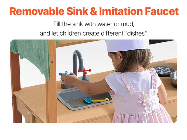 Cool Play Space: This mud kitchen features a striped canopy on top, giving it the look of an outdoor playhouse that will capture children's attention. The canopy provides shade, protecting kids from harsh sunlight when used outdoors and helping to prevent sunburn. Made from high-strength polyester material, it is highly durable, tear-resistant, and built to withstand long-term outdoor use without showing signs of wear