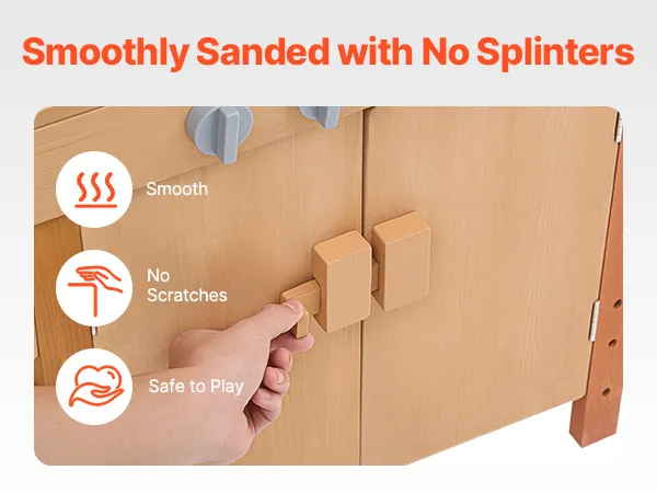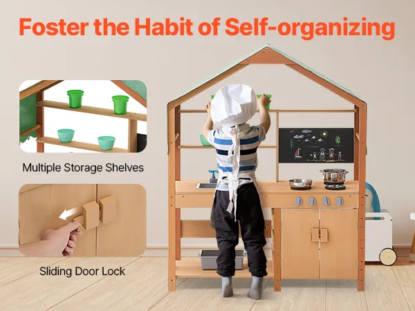 Promote Independence: The pretend play outdoor kitchen is designed with versatile storage cabinets, offering ample space and open shelves so kids can arrange their items according to their preferences. This helps them develop organizational skills and learn to tidy up independently. The cabinet doors feature sliding latches to keep them closed and can also serve as handles, making it easier for kids to open the doors and access their belongings