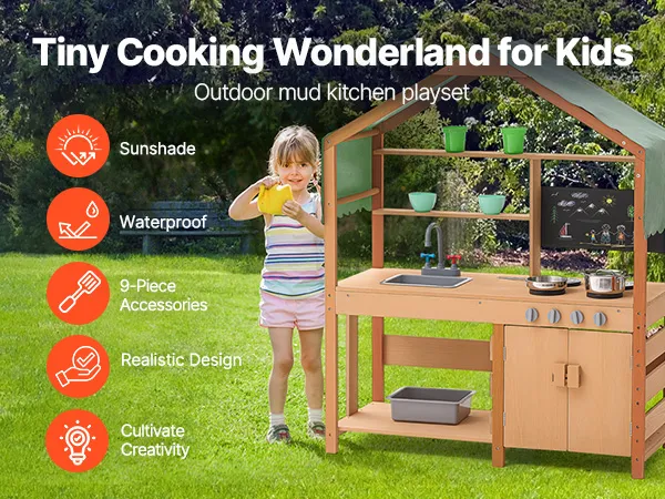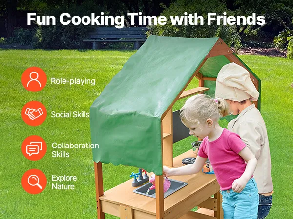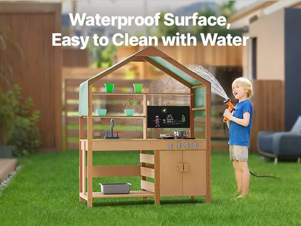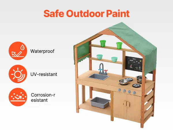 This toddler play kitchen is treated with outdoor-grade paint for water and corrosion resistance, providing a shaded area for kids to play. It's perfect for use in gardens, backyards, and lawns.