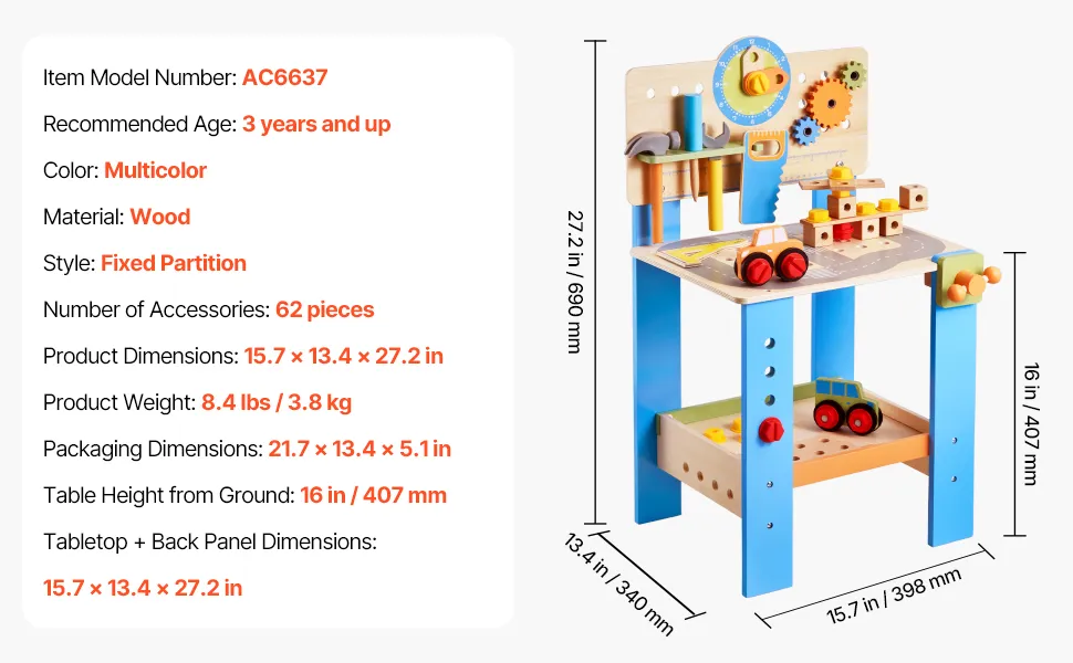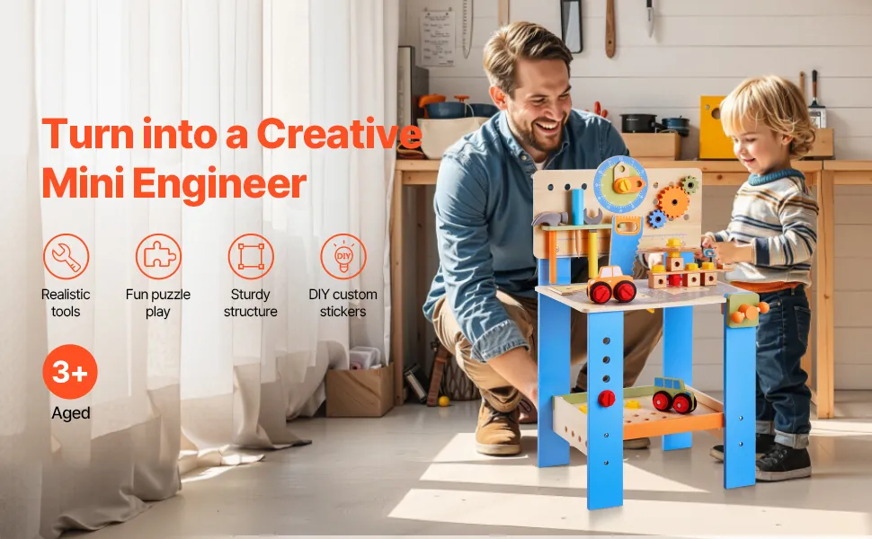 Organize and Play: At 27.7 inches tall, this workbench provides plenty of space for tools and accessories. With multifunctional holders and a large storage tray, kids can learn to keep their play area tidy while developing responsibility. A fun way to teach organizing skills and maintaining order!