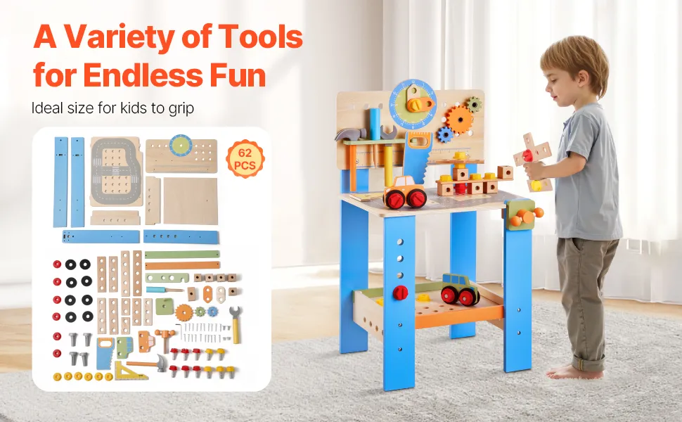 VEVOR Kids Workbench, 62 pcs, Wooden Tool Bench for Kids 3 Years and Up, Toddler Toy Workbench with Realistic Tools, Building Toy Set Creative & Educational Construction Toy for Boys & Girls