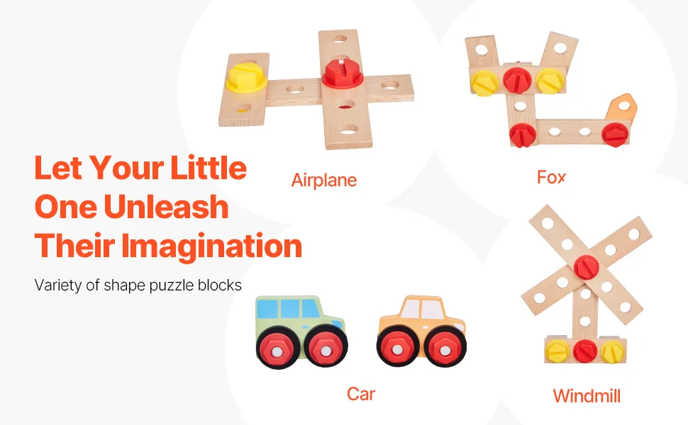 This kids tool bench includes colorful puzzle blocks for endless creative play. Kids can match shapes, improve fine motor skills, and boost logical thinking—building a world of imagination, one block at a time!