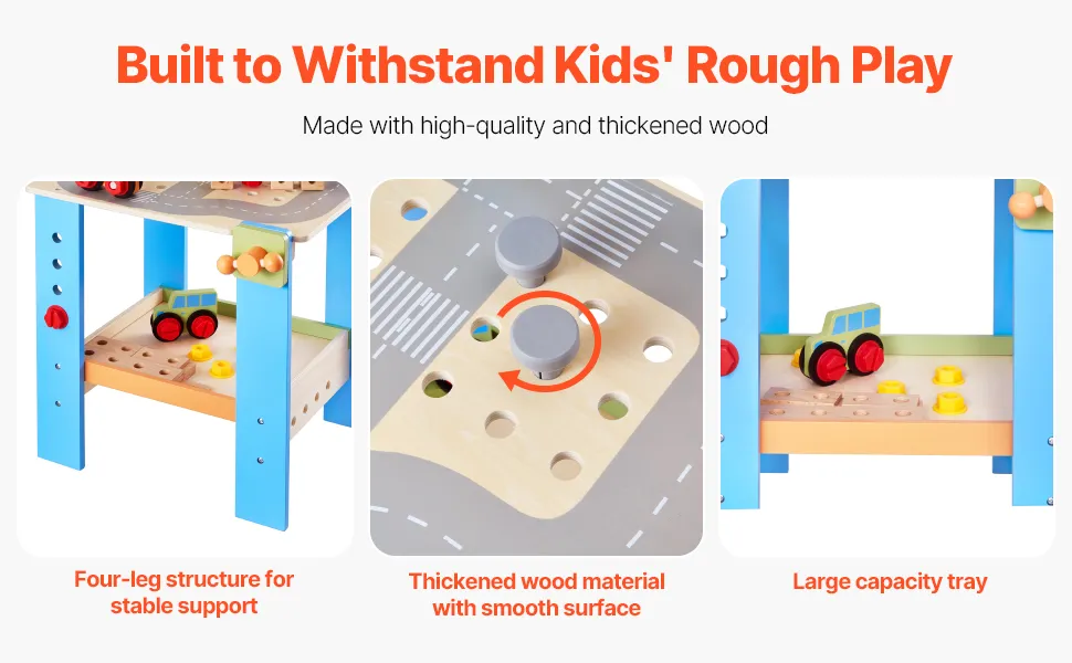 Unleash Creativity: Let your child build and play! This workbench comes with fun puzzle blocks in various shapes and a road-themed tabletop. Kids can create cars and enjoy road games while improving motor skills, problem-solving, and boosting their creativity through open-ended play.
