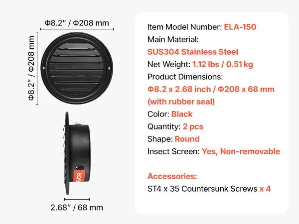 VEVOR 145 mm Wall Vent Cover, Louvered Round AC Vent Gable Cover, Premium Stainless Steel & with Built-in a Protection Screen, for House,Bathroom,Garage,Kitchen,Basement (2 Pack, Black) VEVOR 145 mm Wall Vent Cover, Louvered Round AC Vent Gable Cover, Premium Stainless Steel & with Built-in a Protection Screen, for House,Bathroom,Garage,Kitchen,Basement (2 Pack, Black)