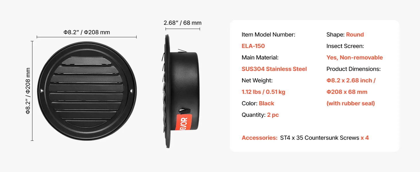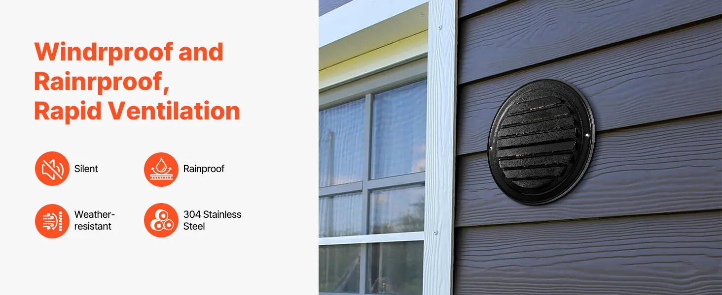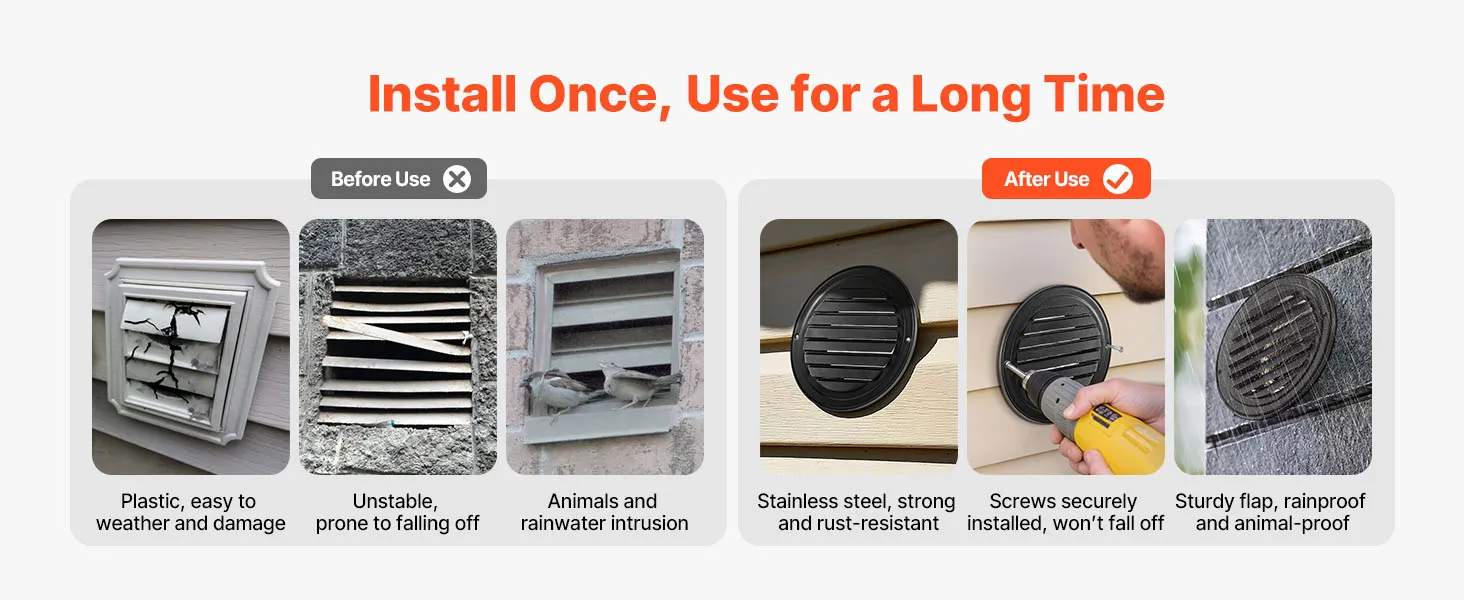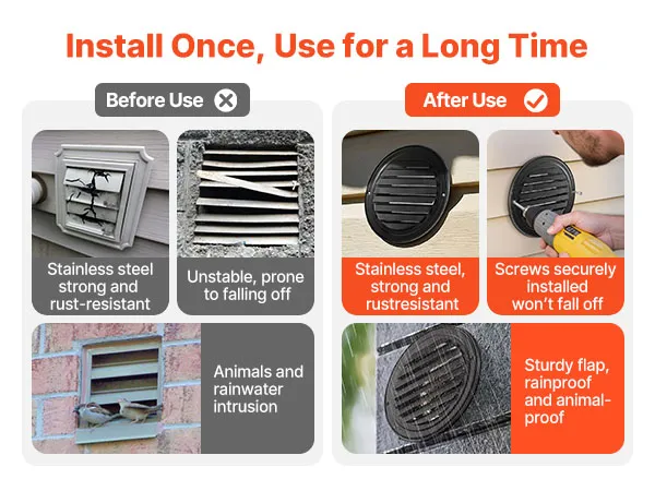 • Built to Last: Made from high-quality 304 stainless steel, it is more damage-resistant and warping-resistant compared to regular hardware or plastic components. The rainproof flap design helps protect the vent from rain and other outdoor elements