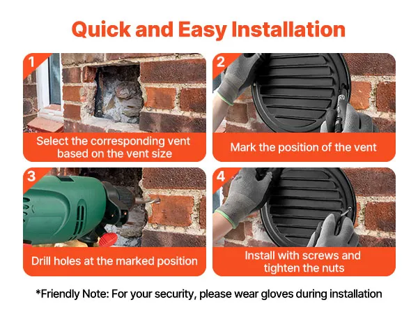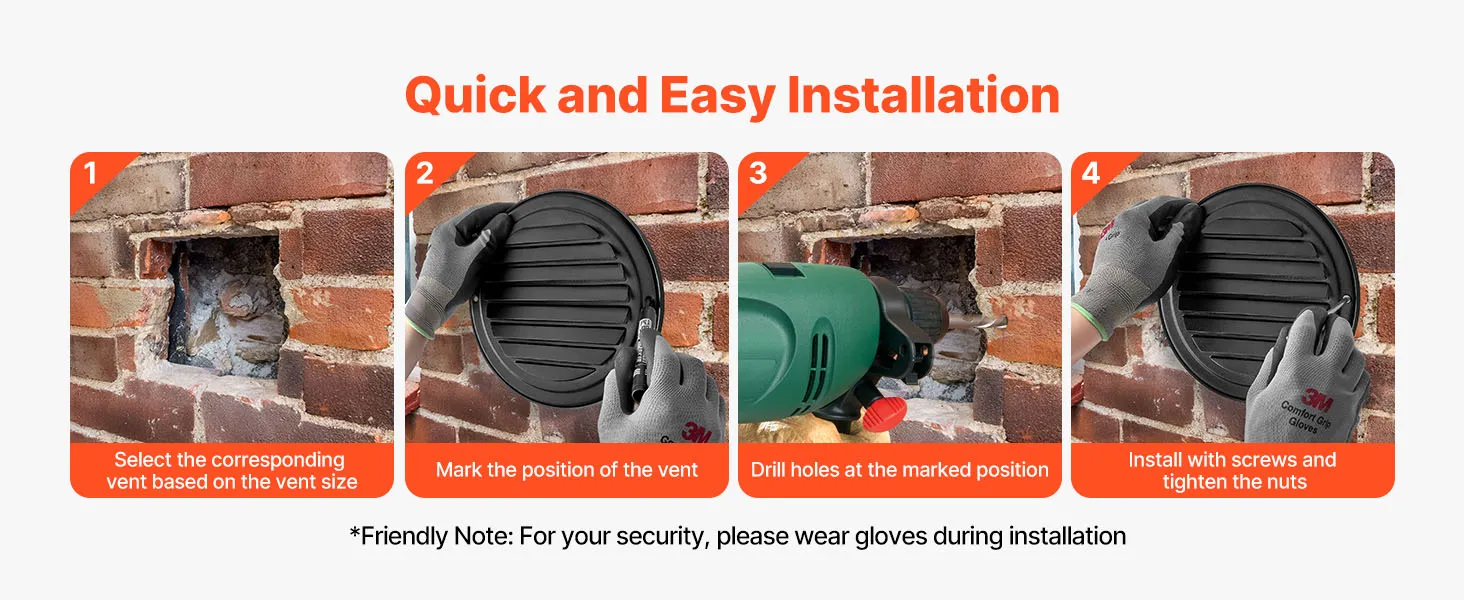 • Easy Wall Installation: Suitable for installation on most wall types, including natural stone, brick, wood, or concrete walls. The vent has pre-drilled holes, allowing you to simply mark the position on the wall, drill, and secure with screws