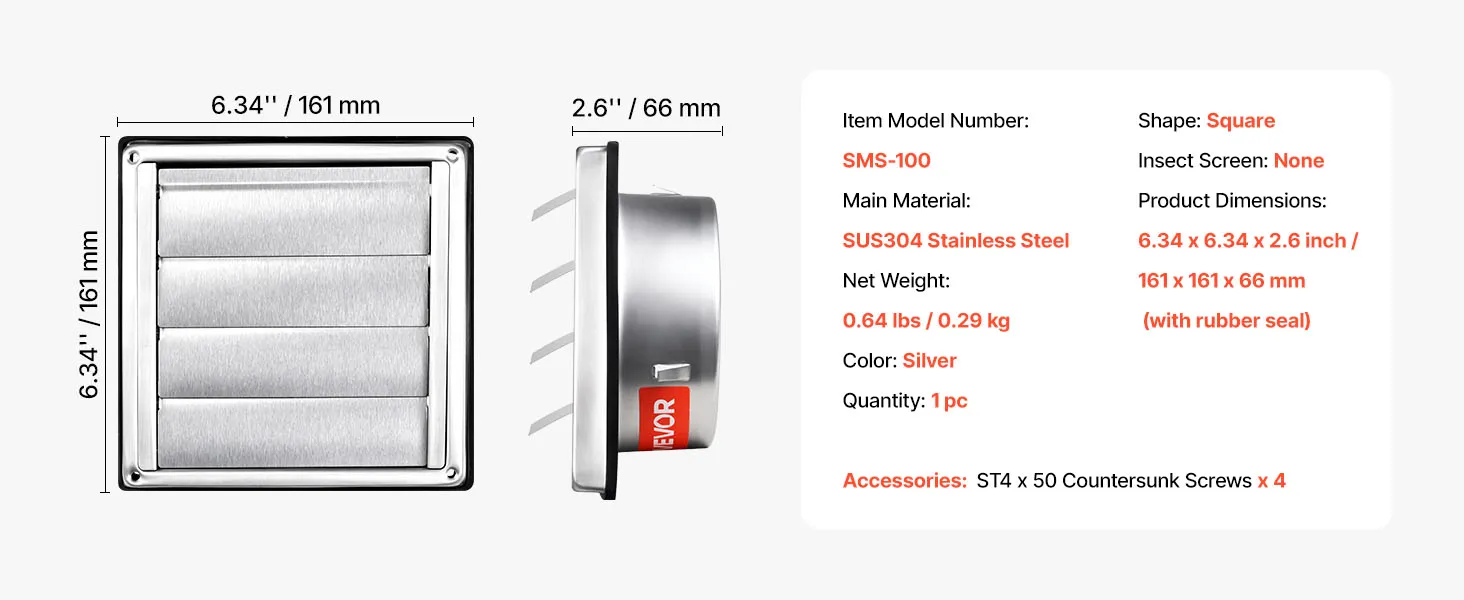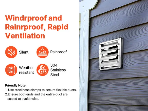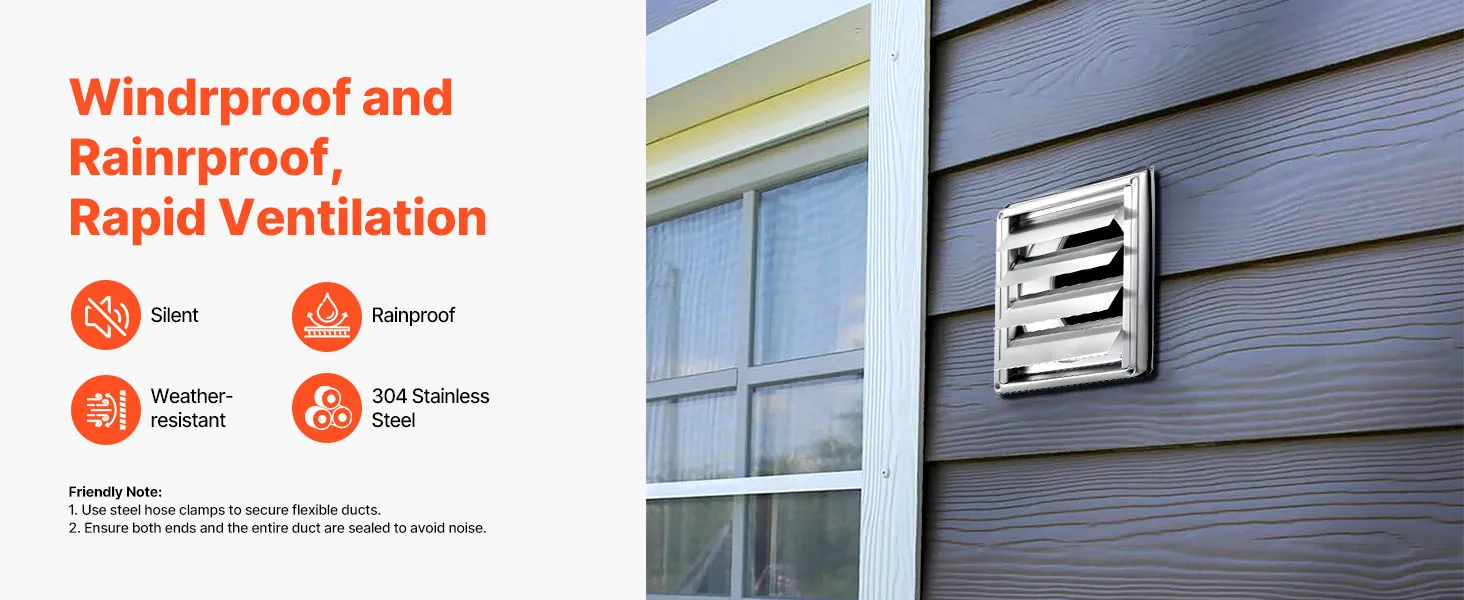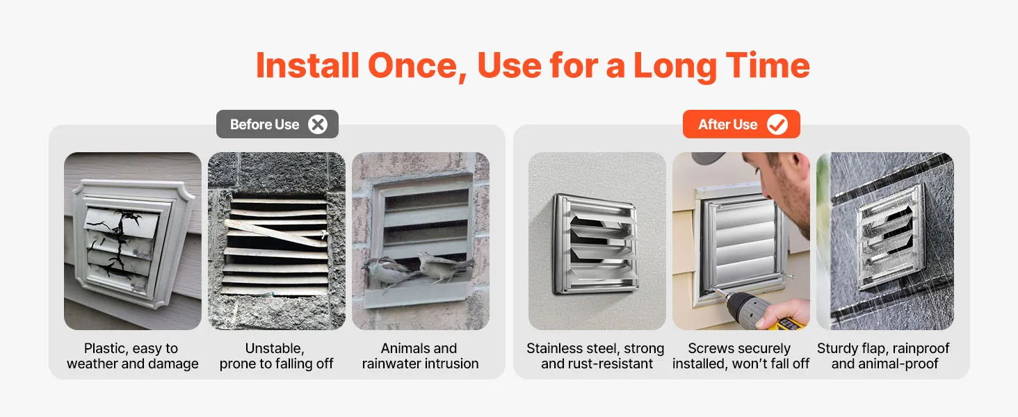 Built to Last: Made from high-quality 304 stainless steel, it is more damage-resistant and warping-resistant compared to regular hardware or plastic components. The rainproof flap design helps protect the vent from rain and other outdoor elements
