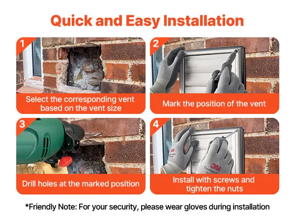 Easy Wall Installation: Suitable for installation on most wall types, including natural stone, brick, wood, or concrete walls. The vent has pre-drilled holes, allowing you to simply mark the position on the wall, drill, and secure with screws