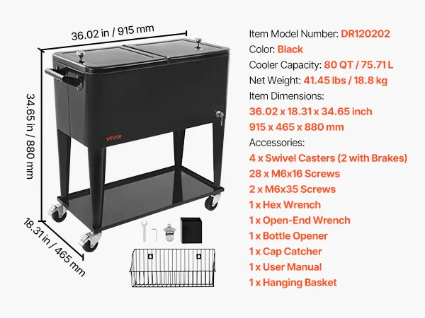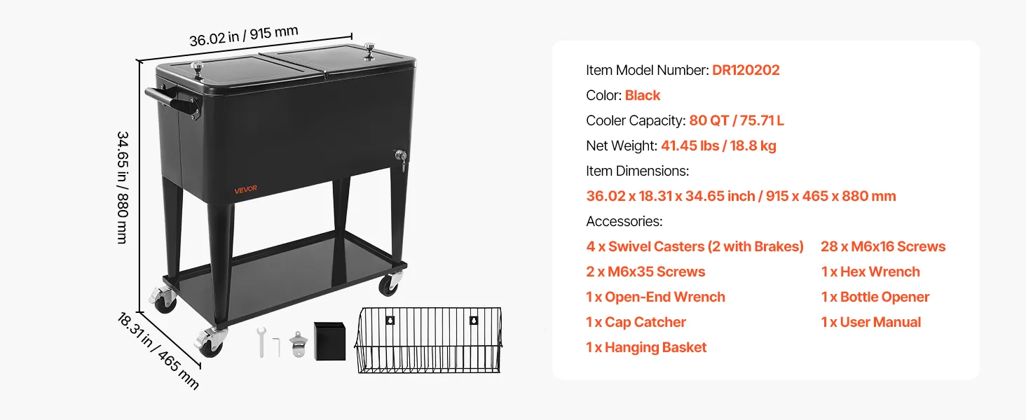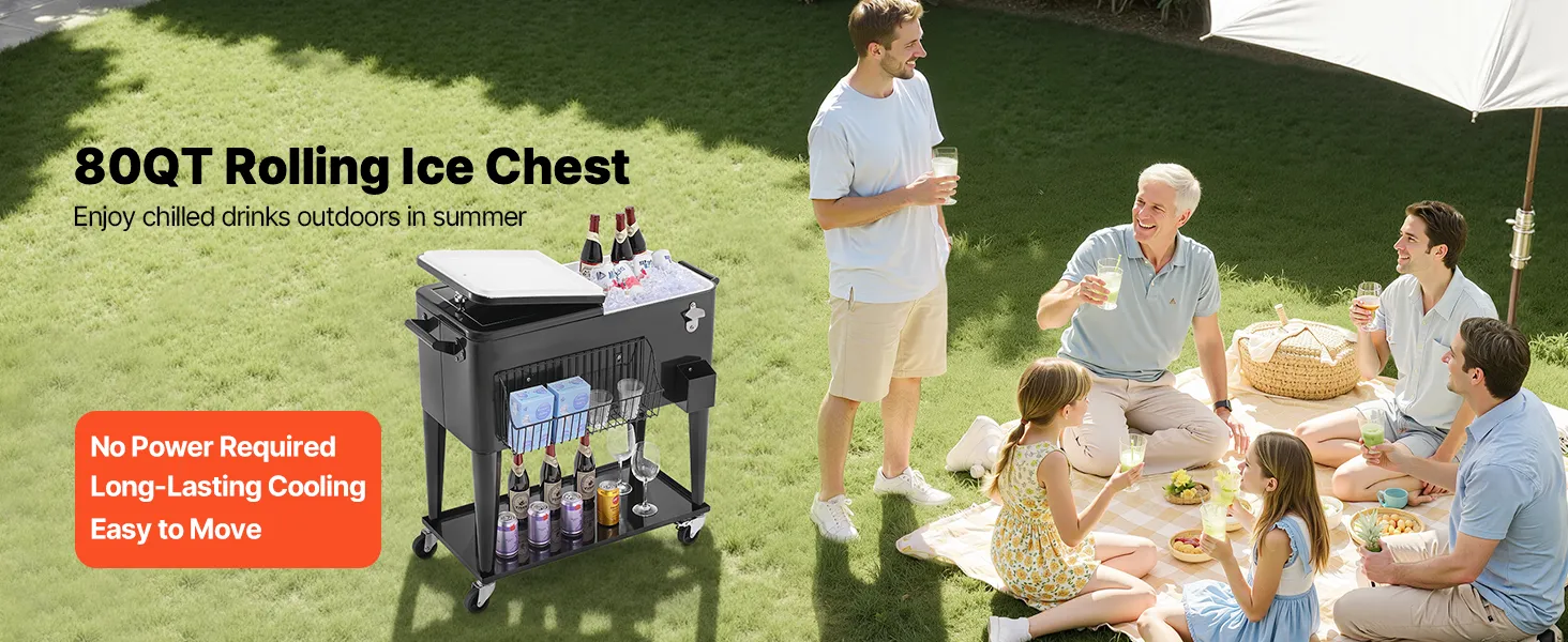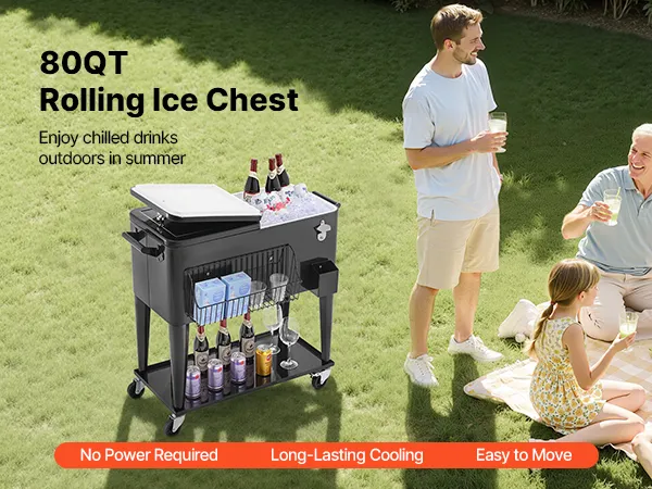 This outdoor cooler cart features an 80QT large capacity, holding plenty of beer, drinks, and ice. It requires no electricity, keeps items cold for long hours, and is easy to move, bringing refreshing enjoyment outdoors.