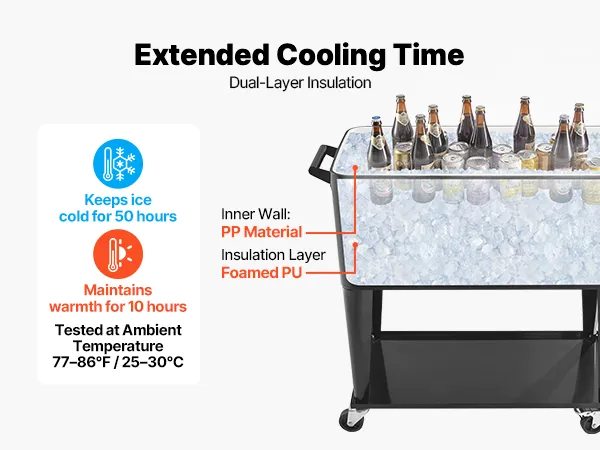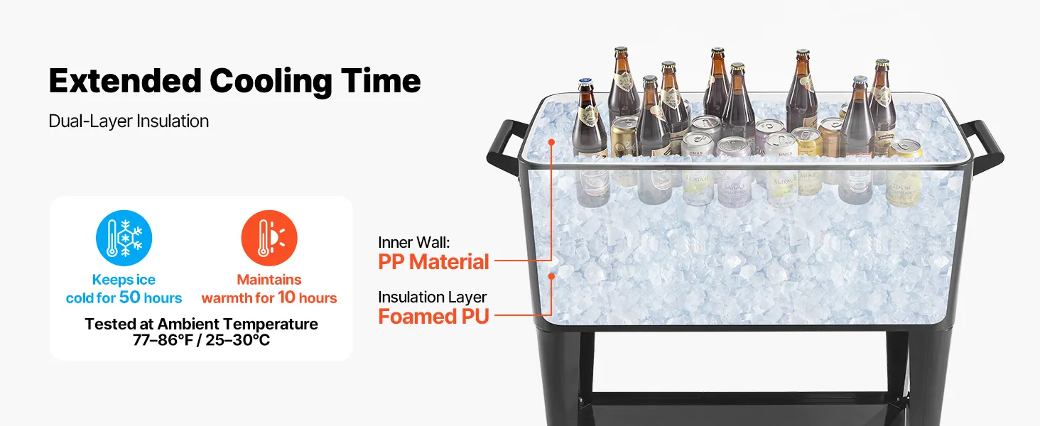 Long-Lasting Cooling: Our cooler cart features a PP inner wall with PU foam insulation, keeping items cold for up to 50 hours and warm for 10 hours without electricity. Enjoy refreshing drinks all day during outdoor events