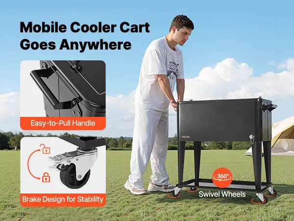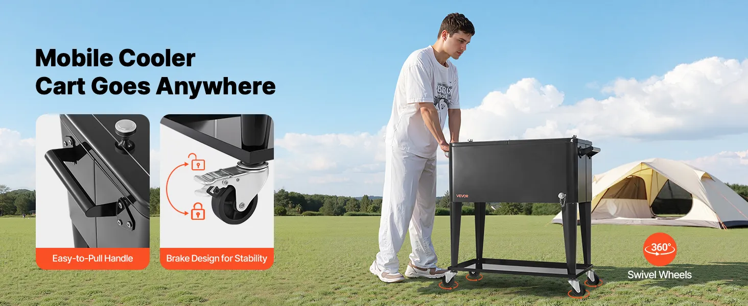 Easy Mobility: This patio cooler is equipped with four 360° swivel casters for smooth movement, with two lockable wheels to secure the cart in place and prevent sliding for added stability