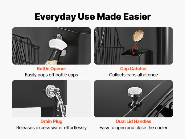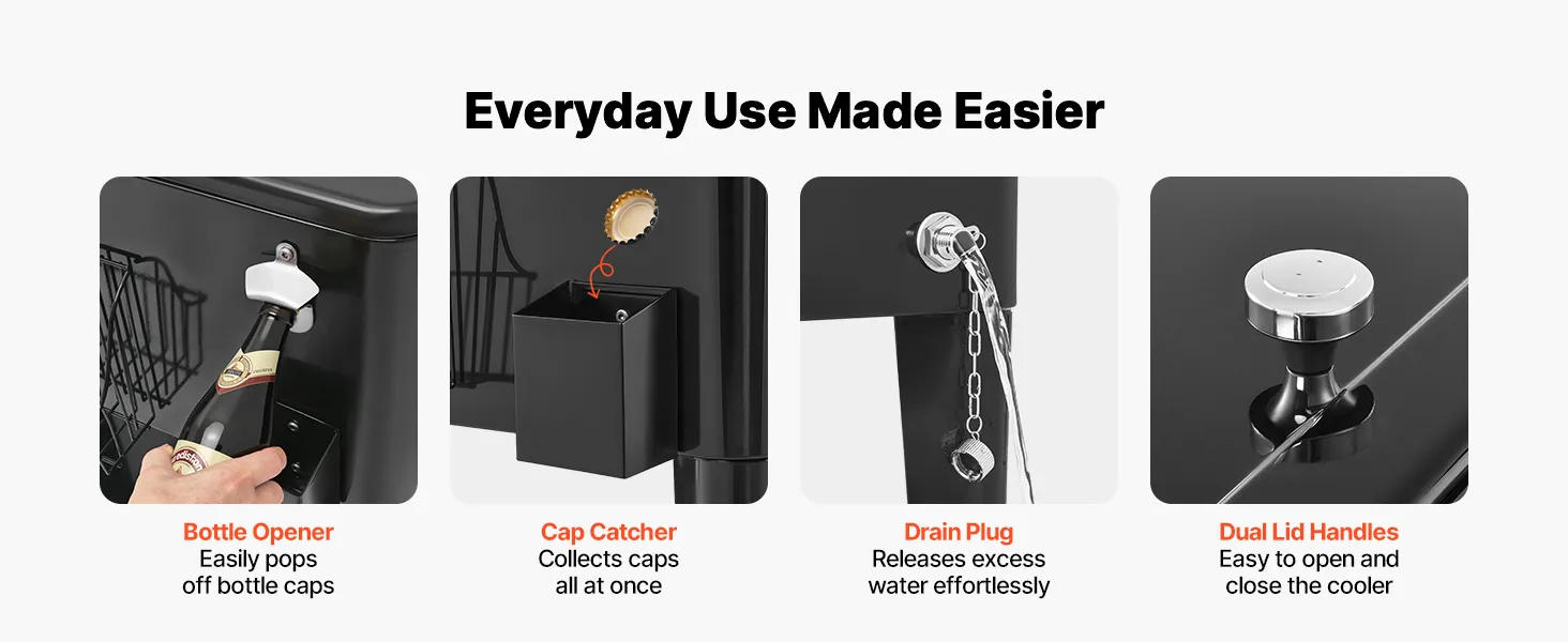 The cart comes with a built-in bottle opener and a cap collector to keep caps organized, a drain plug for quick water release, and dual lid handles for smooth opening and closing, making daily use more convenient.