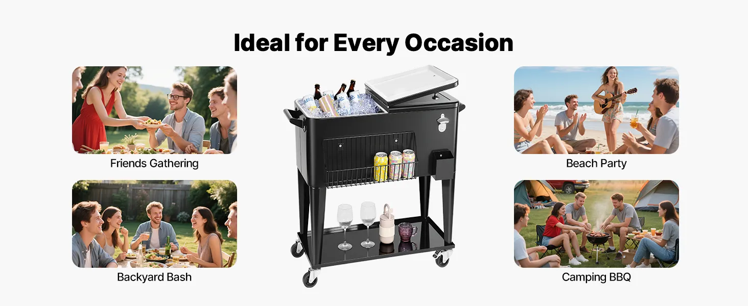 Ideal for gatherings with friends, beach parties, backyard events, or camping BBQs, this rolling cooler cart keeps your drinks cool and makes every summer gathering more enjoyable.