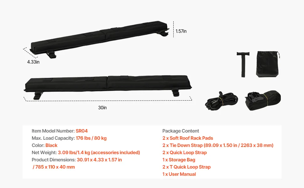 VEVOR Soft Roof Rack Pads, 30" Universal Car Roof Rack Pad for Various Crossbars, 176LBS Loading Luggage Kayak Carrier with 2 Tie Down Straps, 2 Quick Loop Straps & Storage Bag for SUP Canoe Snowboard