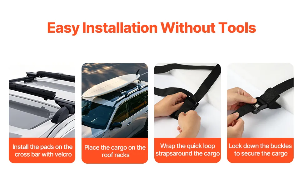 Effortless Installation: No tools required! Simply use the included 2 tie down straps, 2 quick loop straps, 2 T-shaped hooks to secure the soft roof rack bars for most crossbars to your car roof, quickly and easily fastening your gear in place.