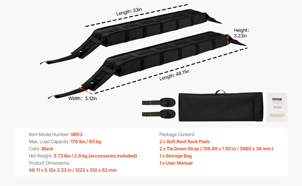 Effortless Installation: No tools required! Simply use the included 2 tie down straps to secure the soft roof rack pads onto your car roof, quickly and easily fastening your gear in place. And they are also easy to store with the provided storage bag.