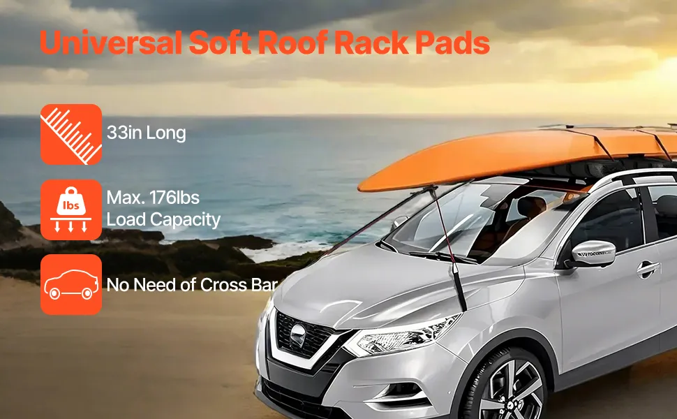 Our 33-in soft roof rack pads are compatible with most vehicles with or without side rails, providing up to 176 lbs load capacity. Crafted from soft yet durable materials, these kayak roof rack pads ensure a secure and reliable solution for transporting kayaks, canoes, SUPs, snowboards, etc.