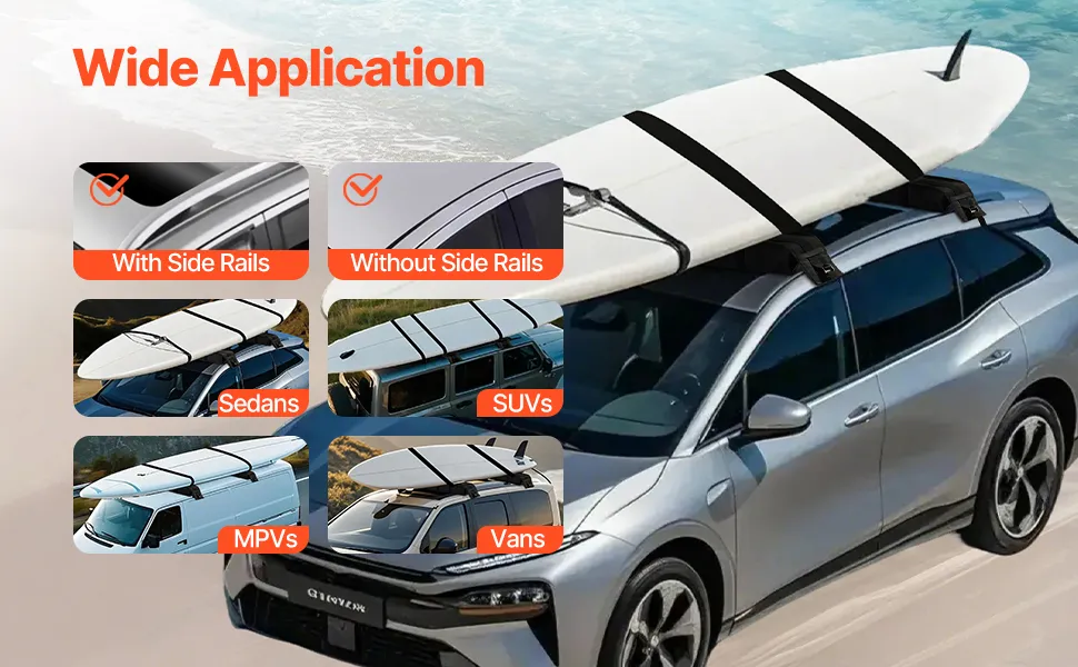 Universal Fit for Most Vehicles: Compatible with most cars without the need for crossbars, our 33-inch universal soft roof rack pads fit vehicles with or without side rails. Perfectly suited for popular 2, 3, 4, and 5-door sedans and SUVs, it's a versatile solution for most cars on the road.