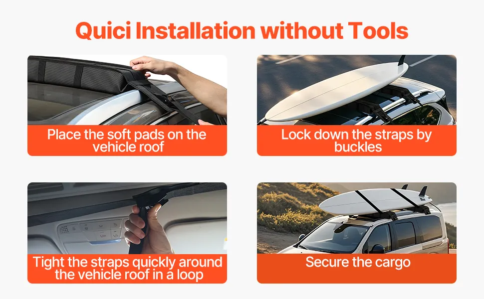 Installation is a easy with adjustable straps and buckles that quickly secure the soft pads to your car roof. In just a few minutes, you can have your roof rack ready, making your travel prep fast and efficient.