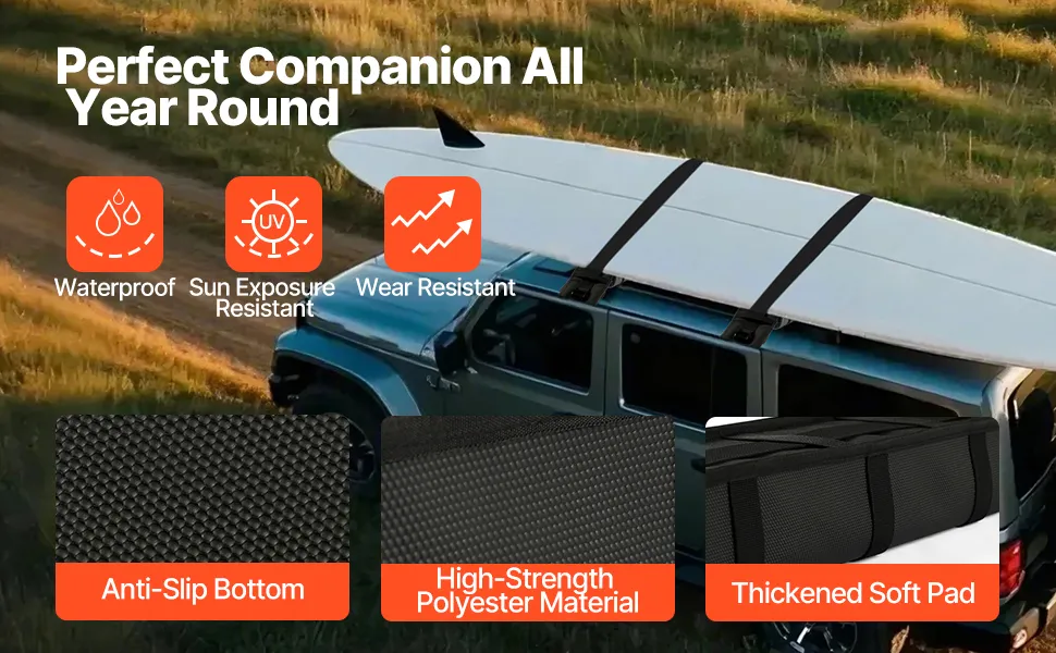 Shock-Absorbing Protection: With a non-slip bottom, the kayak roof rack pads firmly grip your roof while protecting the roof surface from scratches and reducing wind noise. The thickened padding provides soft, shock-absorbing protection, minimizing vibrations during travel.