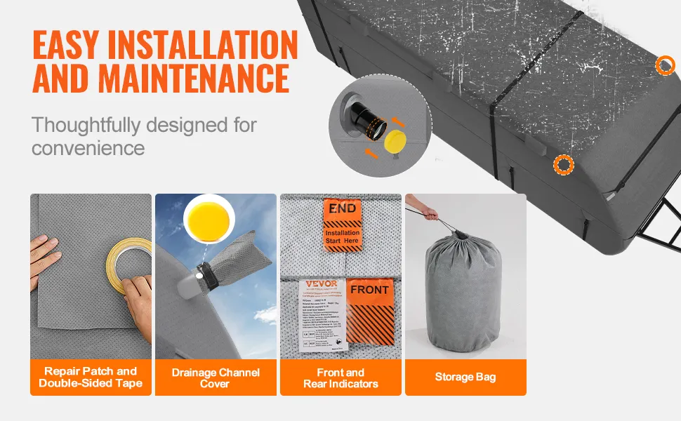 The RV travel trailer cover is equipped with sponge drainage covers, avoiding puncturing for RVs with drainage systems. It features "FRONT" and "END" labels for easy identification during installation. Damage can be quickly repaired with the provided double-sided tape patch.
