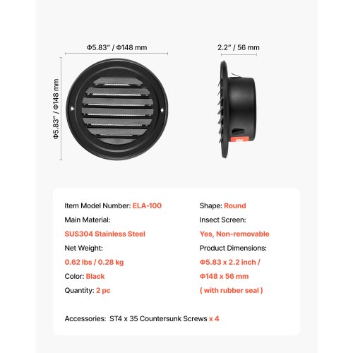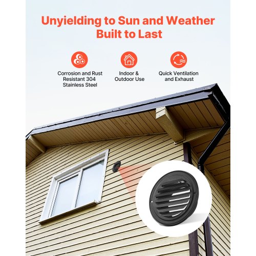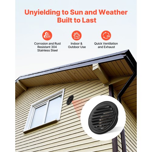 VEVOR 145 mm Wall Vent Cover, Louvered Round AC Vent Gable Cover, Premium Stainless Steel & with Built-in a Protection Screen, for House,Bathroom,Garage,Kitchen,Basement (2 Pack, Black)