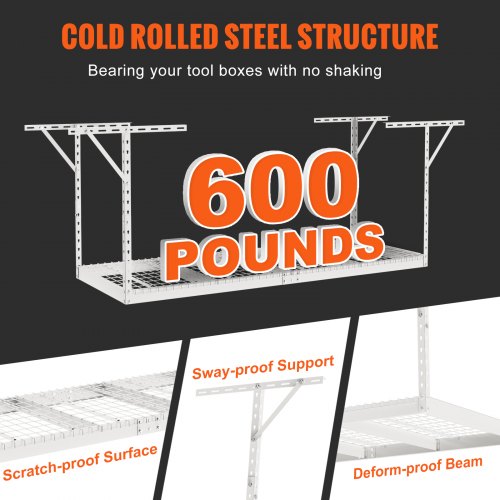 VEVOR Overhead Garage Storage Rack, 48x96 inch Garage Ceiling Storage Racks, Heavy Duty Adjustable Cold Rolled Steel Racks for Garage Storage, Organization, 600 lbs Load Capacity, 22''-40", White