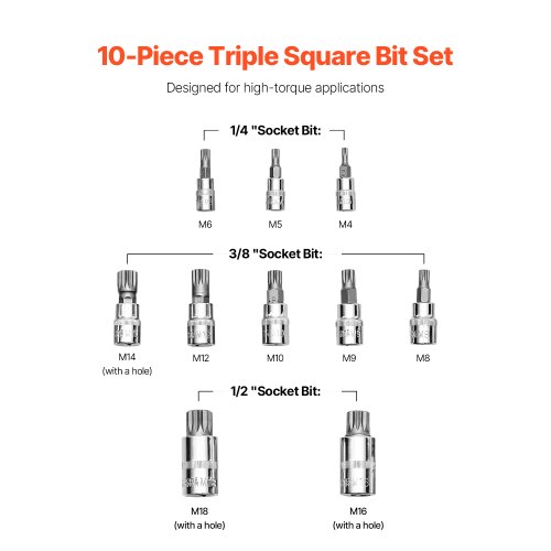 VEVOR XZN Triple Square Spline Bit Socket Set, 10-Piece M4 - M18, Premium Cr-V Steel, 1/4 in, 3/8 in, and 1/2 in Drives, with Enhanced Storage Case, Triple Square Socket Set for Hand Use, Automotive