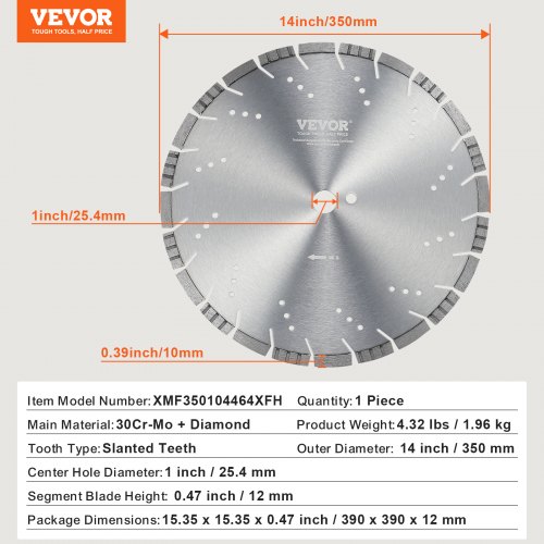 VEVOR Diamond Blade, 14inch/350mm Concrete Saw Blade Wet or Dry, 0.47inch/12mm Wavy Teeth Diamond Segment Blade, Universal 1 inch/25.4 mm Center Hole Diameter, for Concrete Cement Board Tile Brick