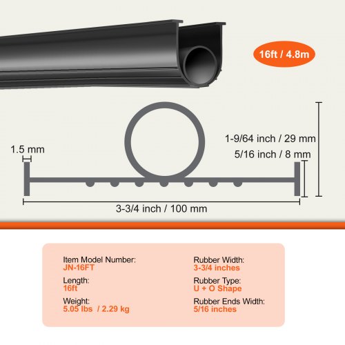 VEVOR Garage Door Seals Bottom Rubber, U Shape +O Ring Combination Garage Door Bottom Weather Seal, 4.88 m Weatherproofing Garage Door Seal, 8 mm T-ends and 9.5 cm Width, for Doors, Black