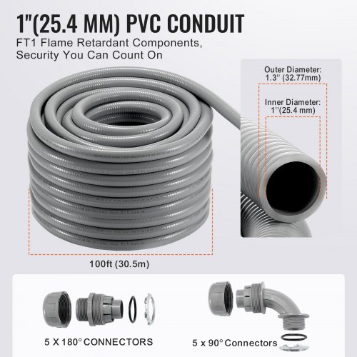 VEVOR 1-Inch Flexible Electrical Conduit, 100 ft, PVC Liquid-Tight Conduit Non-Metallic with 5 Straight and 5 90-Degree Conduit Connector Fittings, for Air Conditioning Motor Controller Pump, IP65