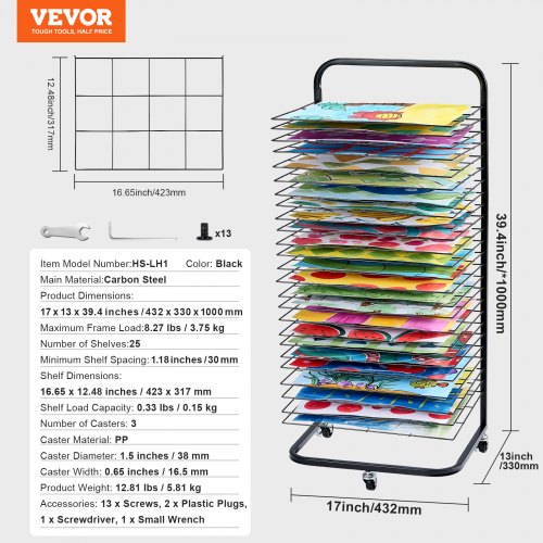 VEVOR Art Drying Rack, 25 Removable Shelves 17 x 13 x 39.4 inch Paint Drying Rack With Lockable Wheels, Carbon Steel Painting Drying Rack for Artwork in Classroom, Art Studios and Schools, Black