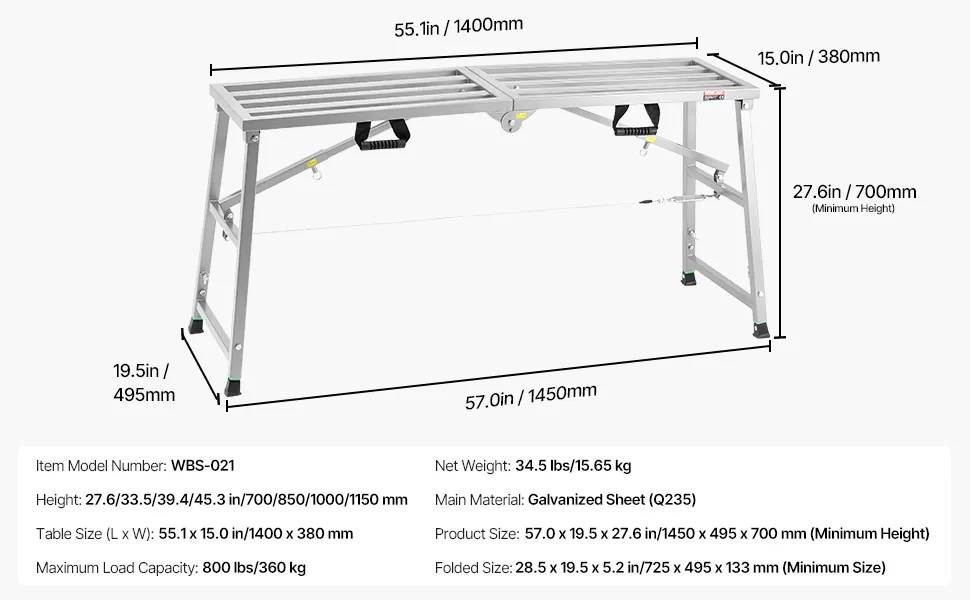 Compact and Easy to Store: The VEVOR work platform is designed with convenience in mind. When folded, it reduces to a compact size of 28.54 x 19.49 x 5.23 inches and weighs only 34.5 lb/15.65 kg. Its lightweight design makes it easy to carry, store, and save space.