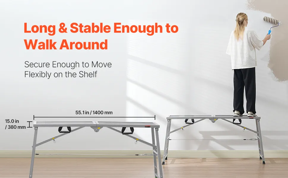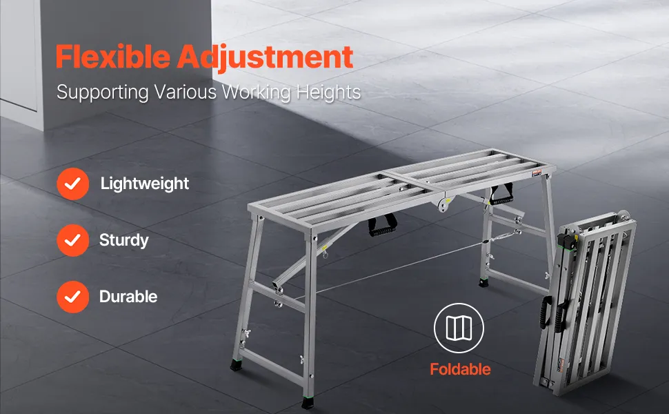 Adjustable Height for Versatility: The scaffolding platform offers a range of height adjustments, with four settings: 27.56 inches, 33.46 inches, 39.37 and 45.28 inches. This adaptability empowers you to tackle a wide range of tasks, from car washing to building renovations, with ease and confidence.