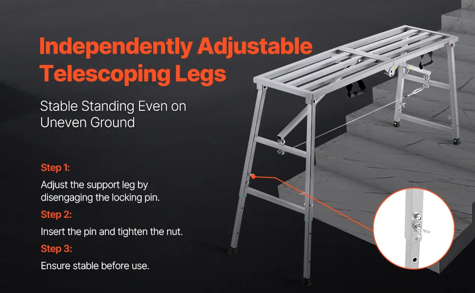 With individually adjustable telescopic legs, you can easily customize the height to suit any work surface, even on uneven ground. This adaptability allows for a firm, safe setup every time.