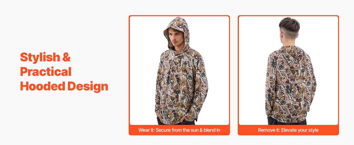 Stretchy Hood Design: The wide brim adds extra sun coverage, while the 4-way stretch hood fits snugly. Wear the camo pullover sweatshirt up for shade and stealth, or down for a sleek, street-ready look—style and function in one