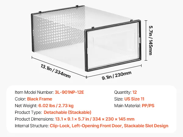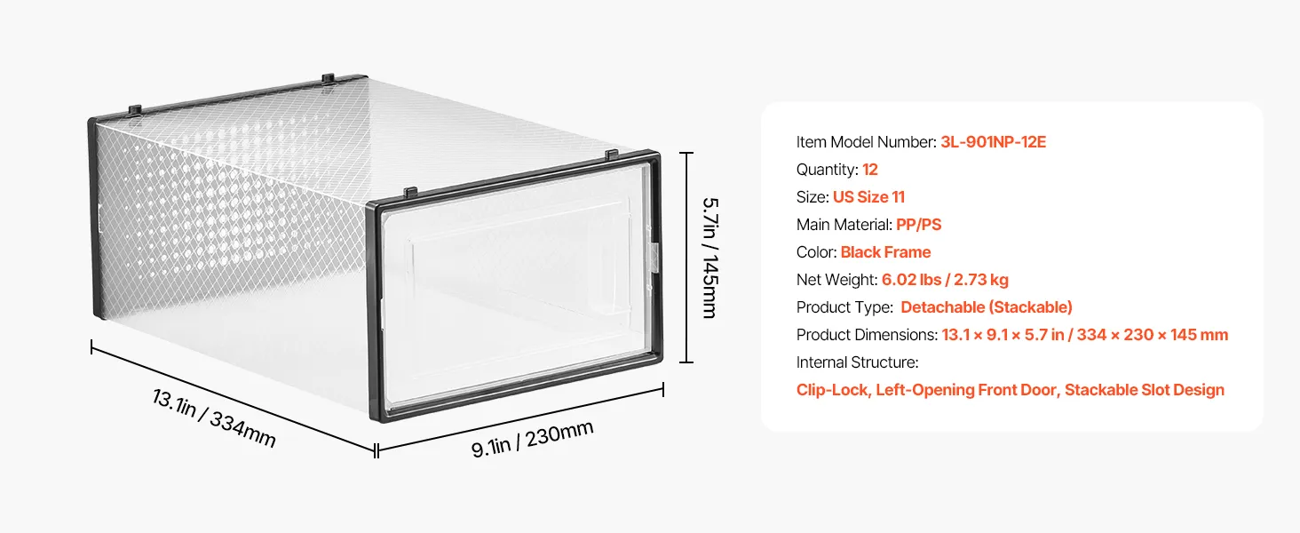 Quick, Tool-Free Assembly: No complicated setup – just 3 easy steps to assemble. The plastic shoe organizer fits up to US Size 11 shoes. The transparent body and front door make it simple to spot your shoes, keeping your space neat and organized
